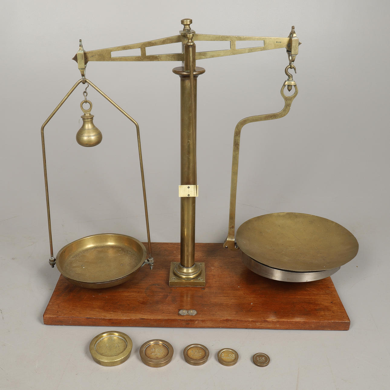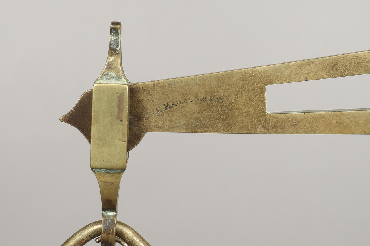 stemplet S.Maw Son&Sons, med to messingpander og fem tilhørende cirkulære stablevægte, 53 cm høj, bund 27 cm gange 56 cm.