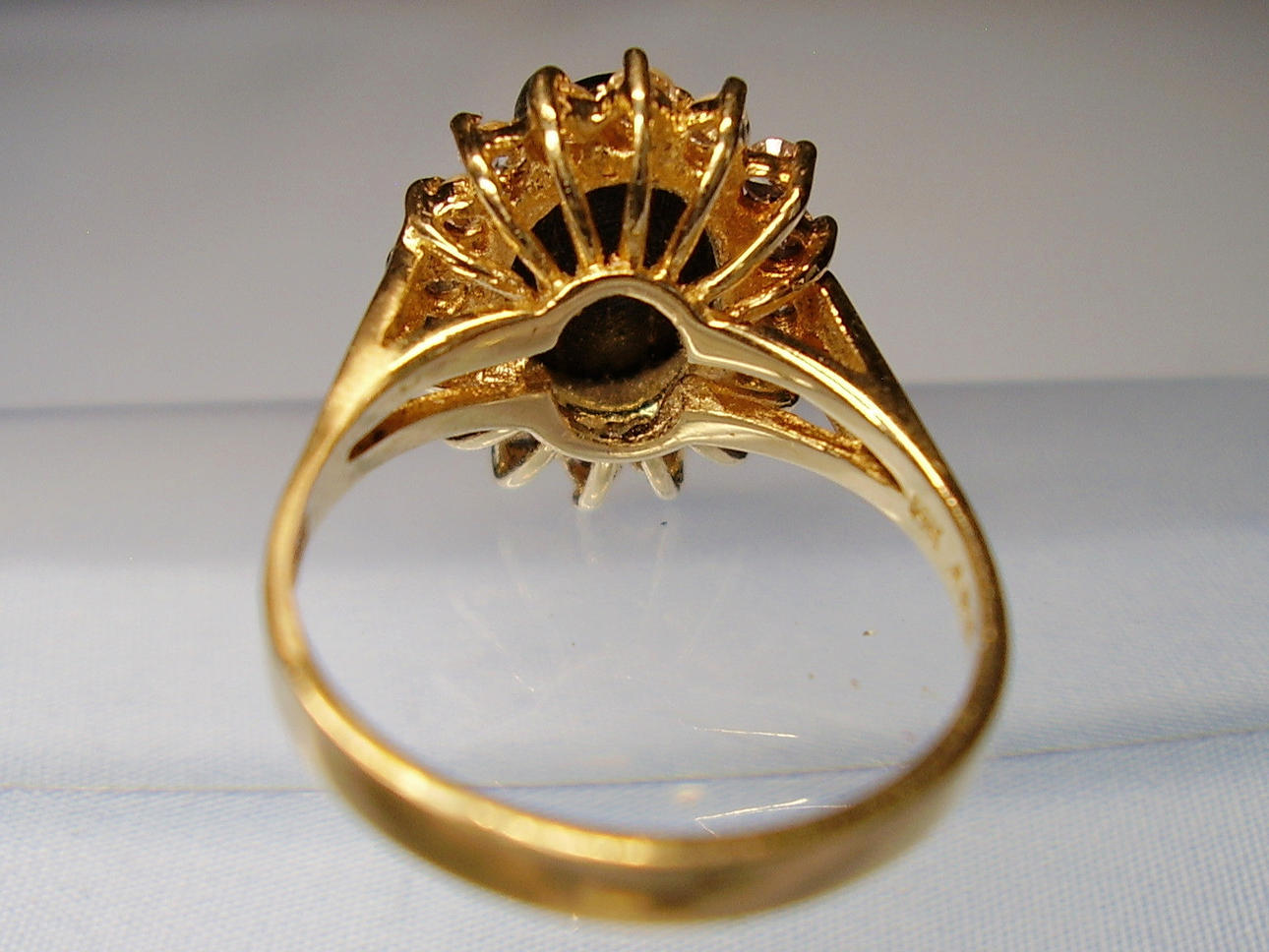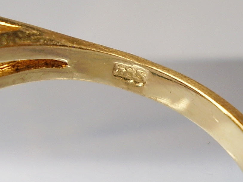 Den ekstravagante ring er lavet af 585 = 14 karat gult guld og stemplet.