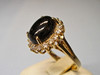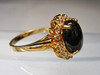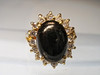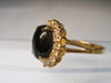 Det er sat med en oval cabochon lavet af sjældne, ægte sorte koraller omgivet af et entourage af 16 runde facetslebne hvide topaser.
