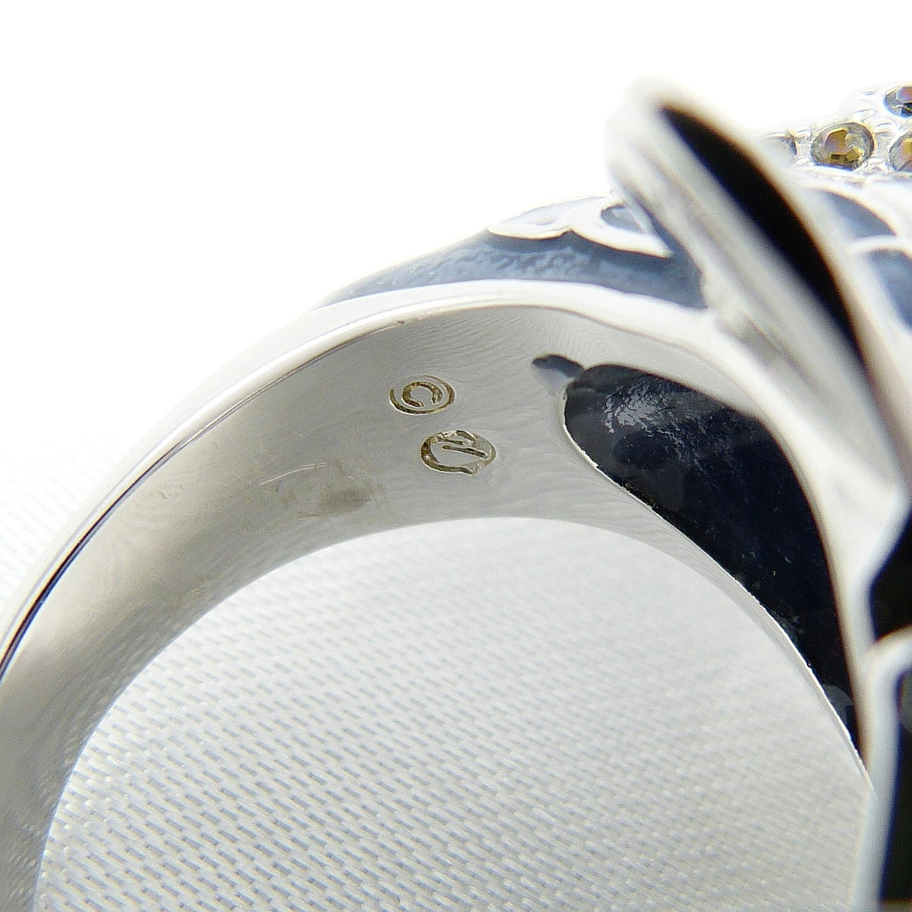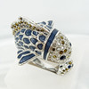 En stor og vægtig Swarovski cocktailring, der forestiller en fisk, besat med Swarovski ædelsten og marcasitter, og indlagt med blå emalje finner og skæl.