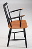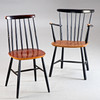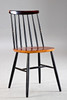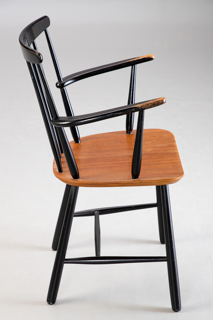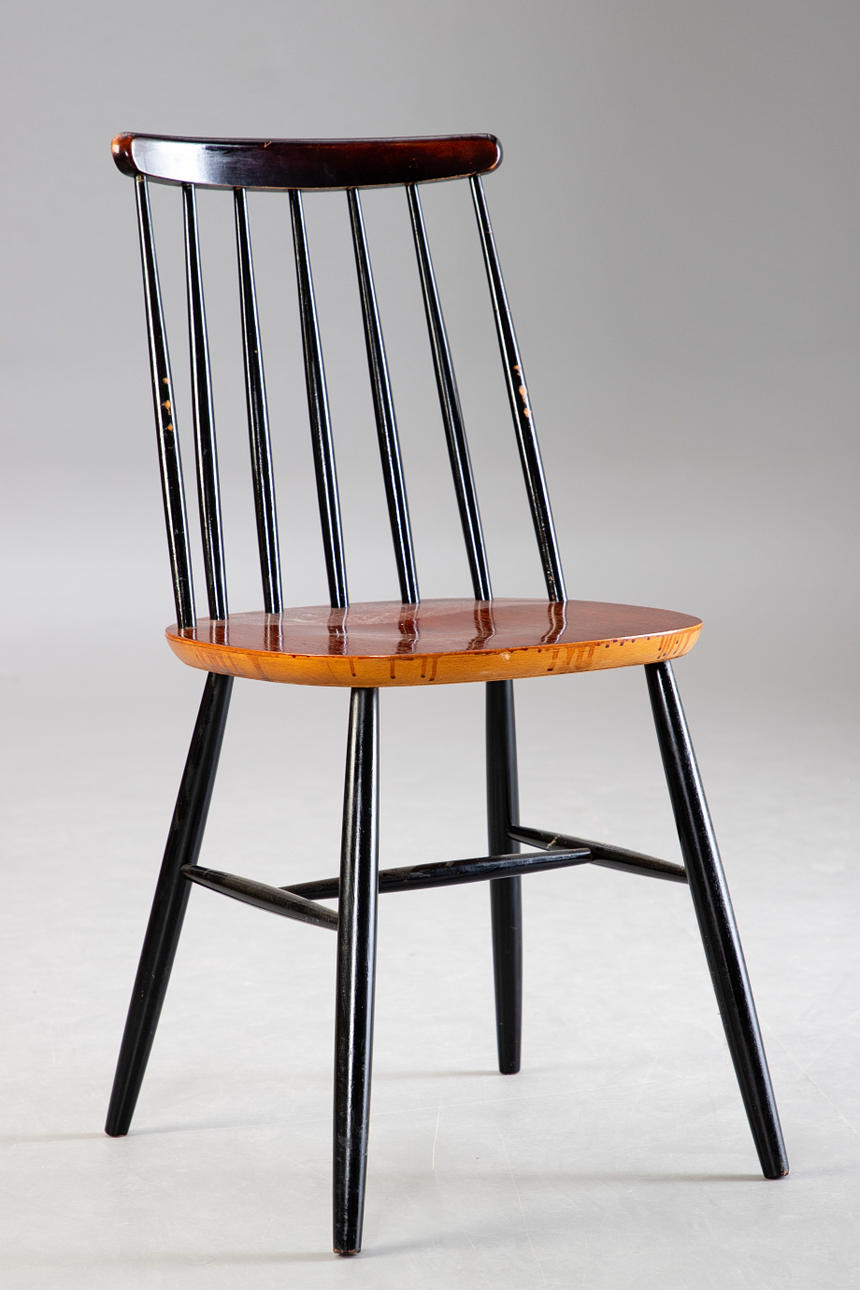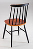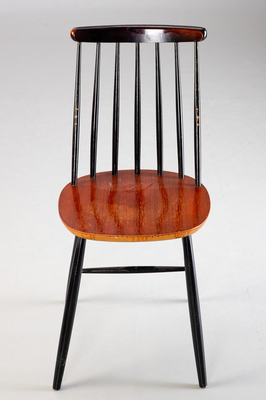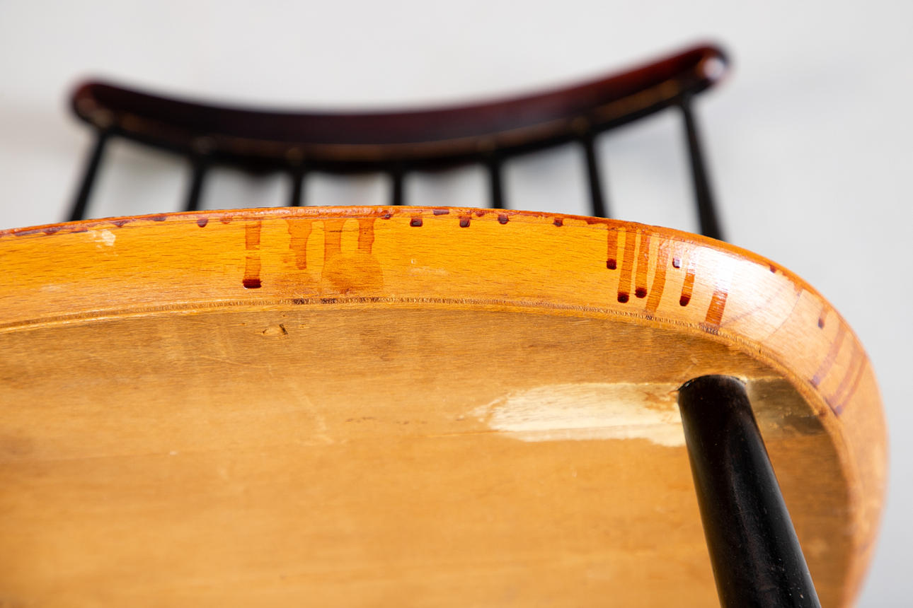 Konstruktion udført i sortlakerede trin og stoleben. Sæde lavet af fineret krydsfiner. HxShxB: 85x44x40/53 cm.