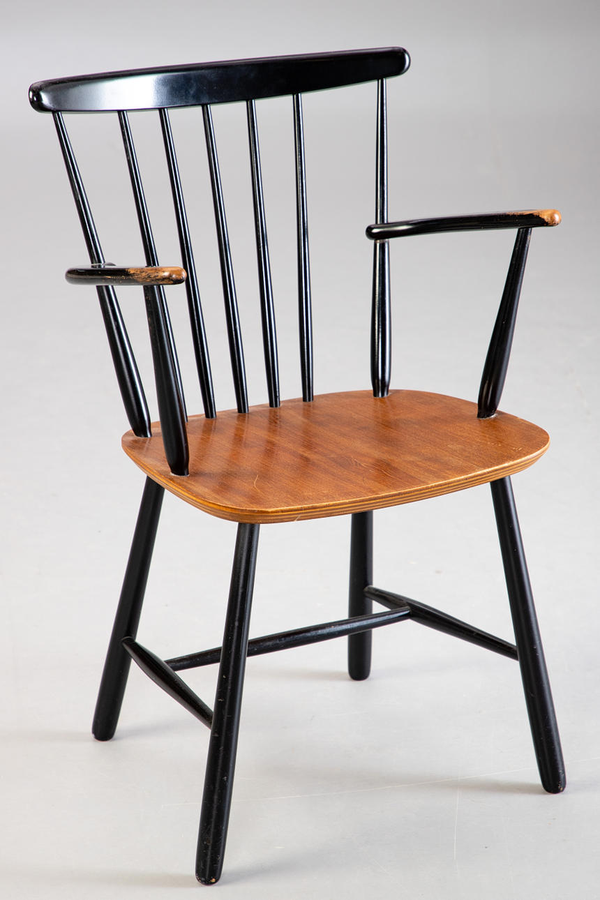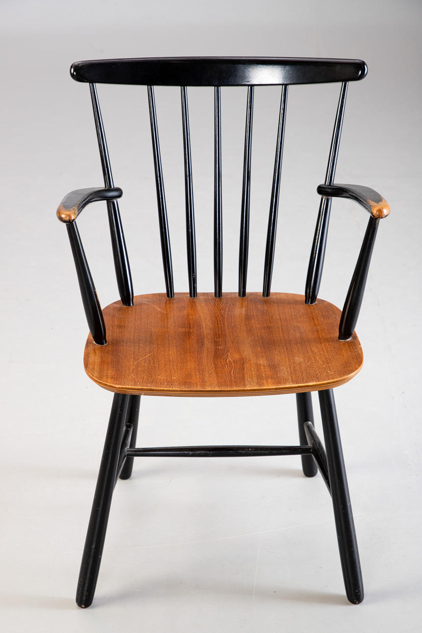 Fremstår med brugsspor, ridser, stød. Afslidning på armlænene, malingsafslag på steder. Lidt vaklende.