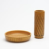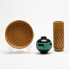 Vase og underkop, "Eterna", stentøj, Gunnar Nylund. Tønde diam 20,5, vase højde 21,5. Klotvas, Ilse Claesson, flinttøj, højde 12 cm.