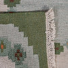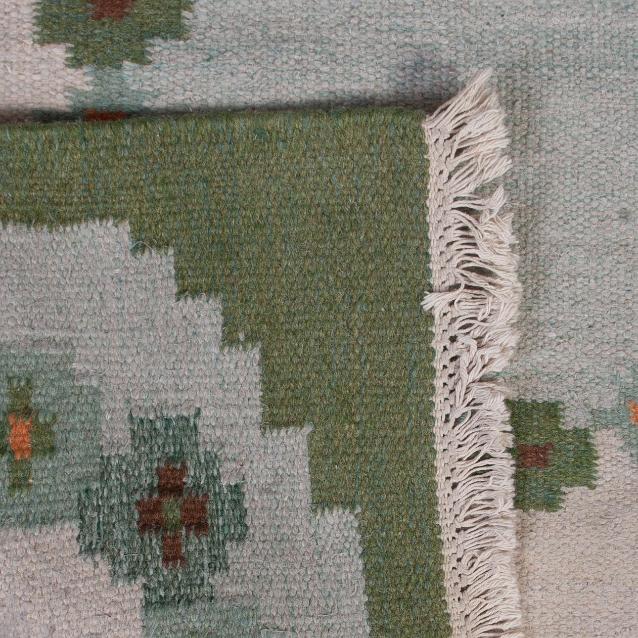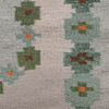 Rolakan tæppe i grønne toner med indslag af brunt og gult 190 x 140 cm uden frynser.