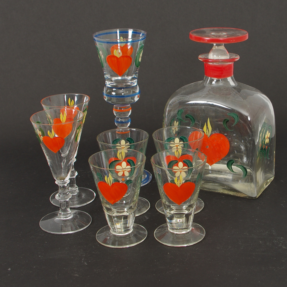 230649. KARFE OG SNAPSE-GLAS, glasmalet dekor.
