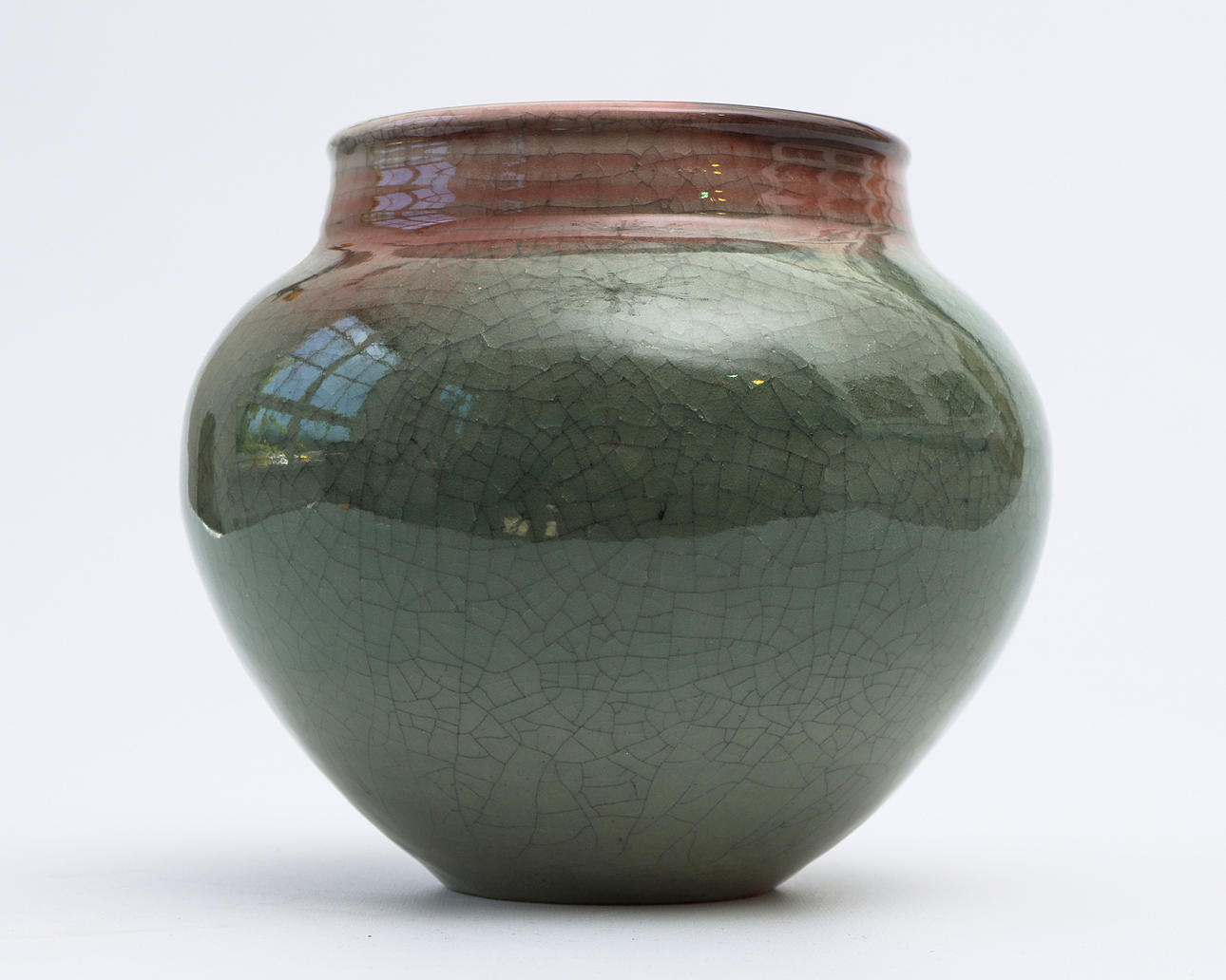 Vase. Udbulet form med en vandret rillet mund. stentøj. Celadonlignende grågrøn glasur, delvist med okseblodslignende præg. knitre. H. 22,2 cm. Mærket i bunden: værkstedsmærke (ridset) med tilføjelse (FTon).