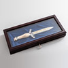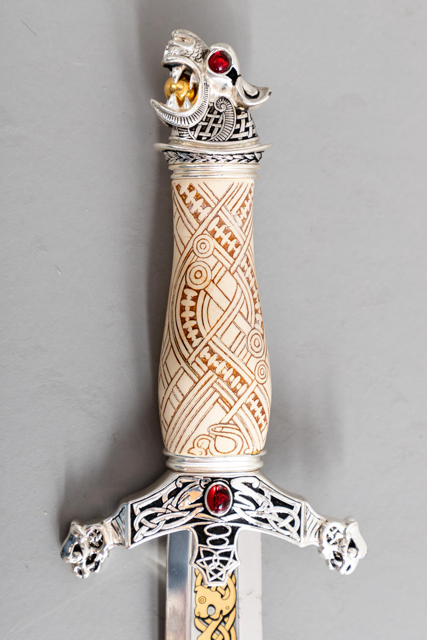 'The Viking Knife' fra Franklin Mint i en fløjlsblød, højkvalitets træmontre. Kniven er lavet efter et originalt design i vikingestil. Den er håndsæt med krystal cabochons og pyntet med 24 karat guld og sterling sølv. Klingen var smedet af hærdet stål. Ægthedscertifikat og informativt hæfte fra producenten til stede. længde ca. 38 cm. træmontre ca. 51x23x7 cm.