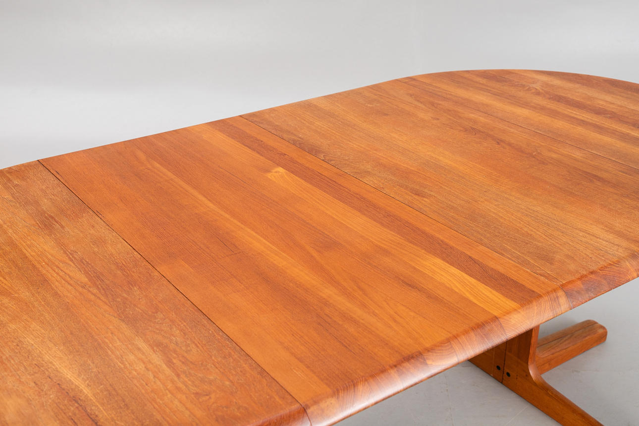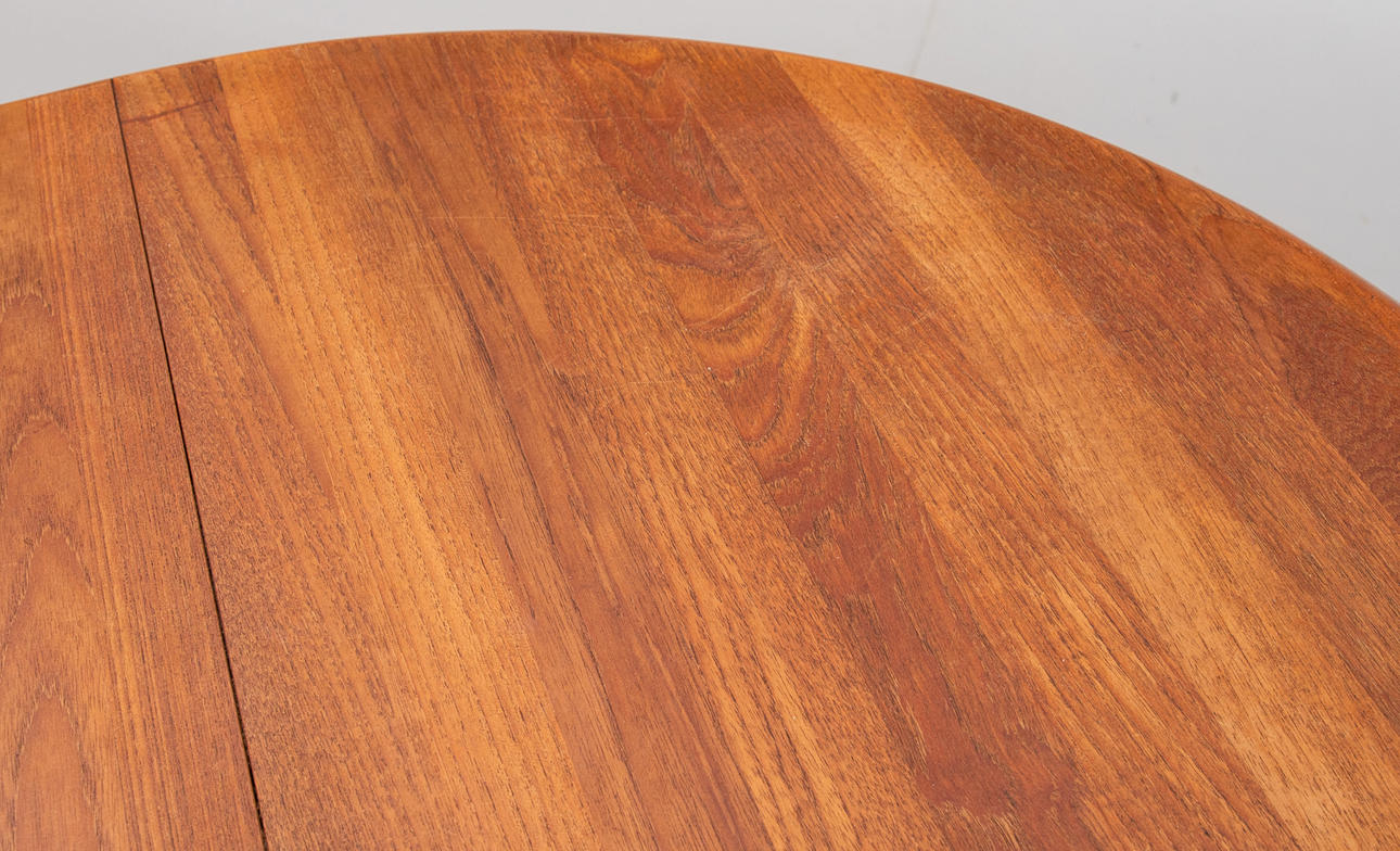 Rundt spisebord i teaktræ. Design fra midten af århundredet. Udtrækkelig, 2 forlængerpaneler til rådighed.