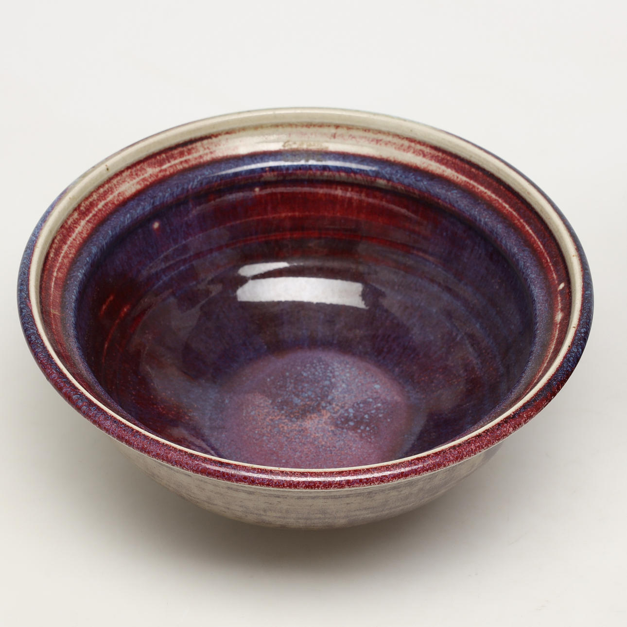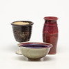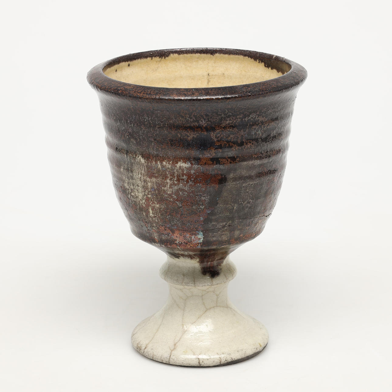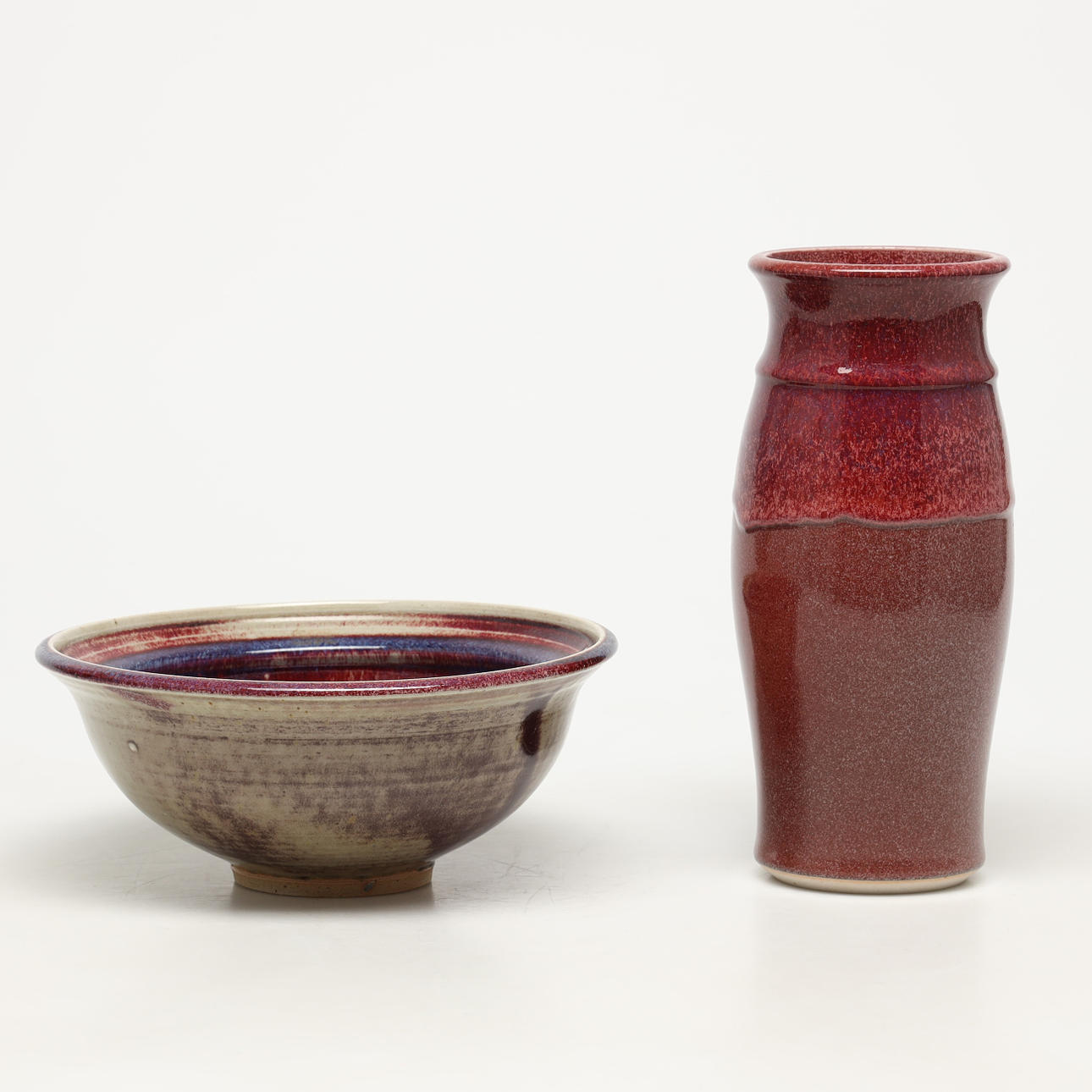 skål og fad, glaseret stentøj, signeret Roger Stribley. Kop i raku-brændt lertøj, umærket højde ca. 19 cm.