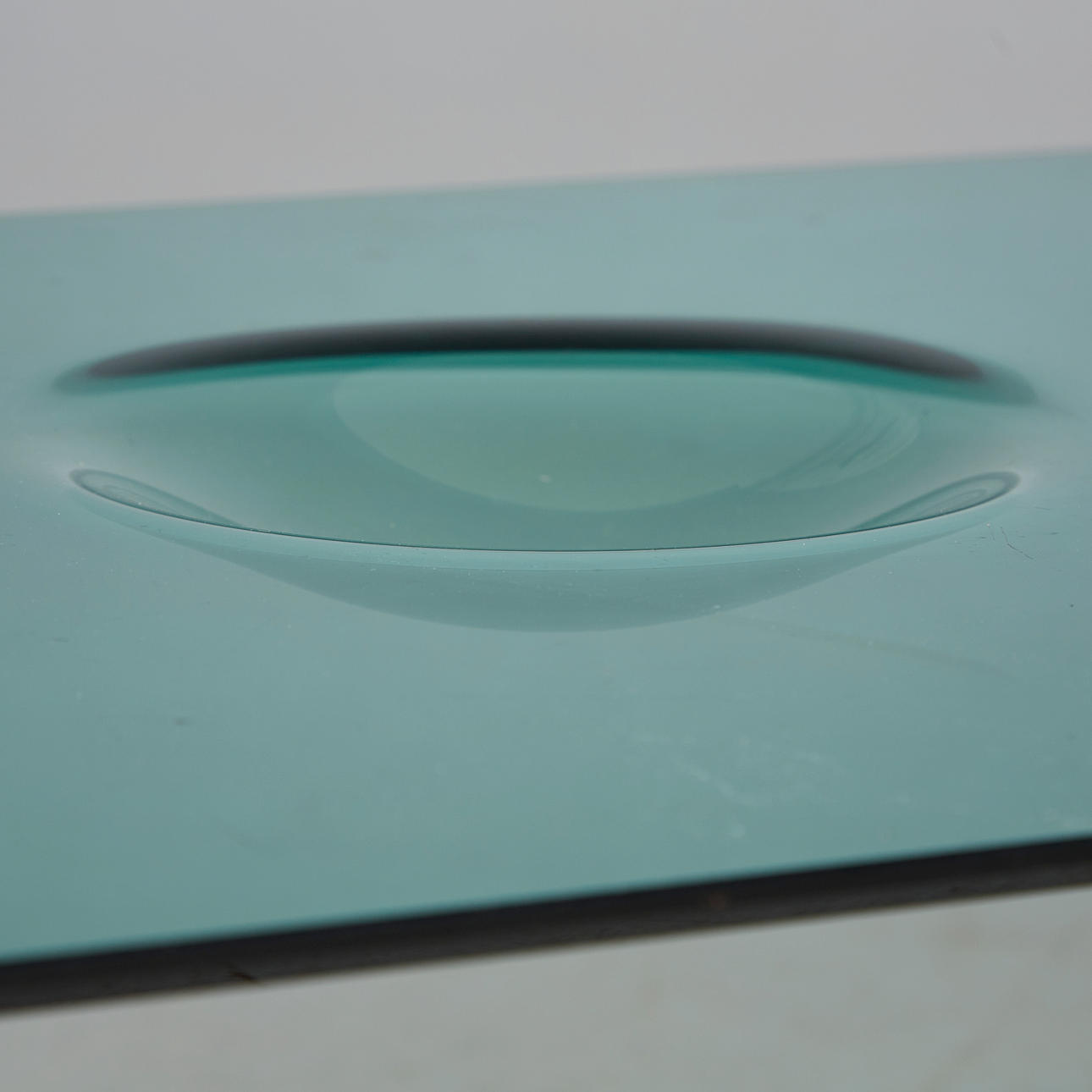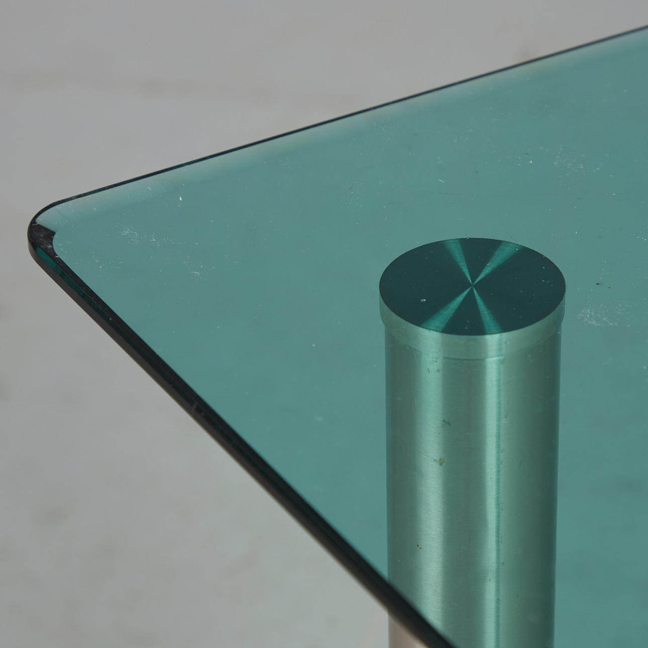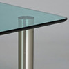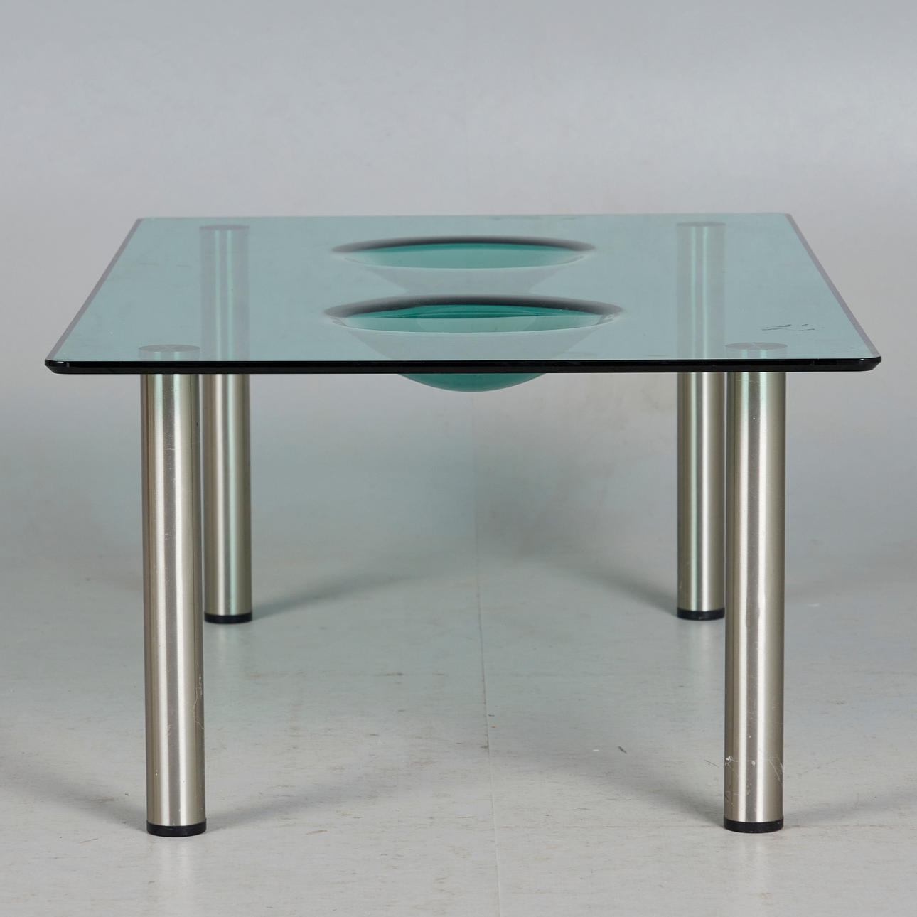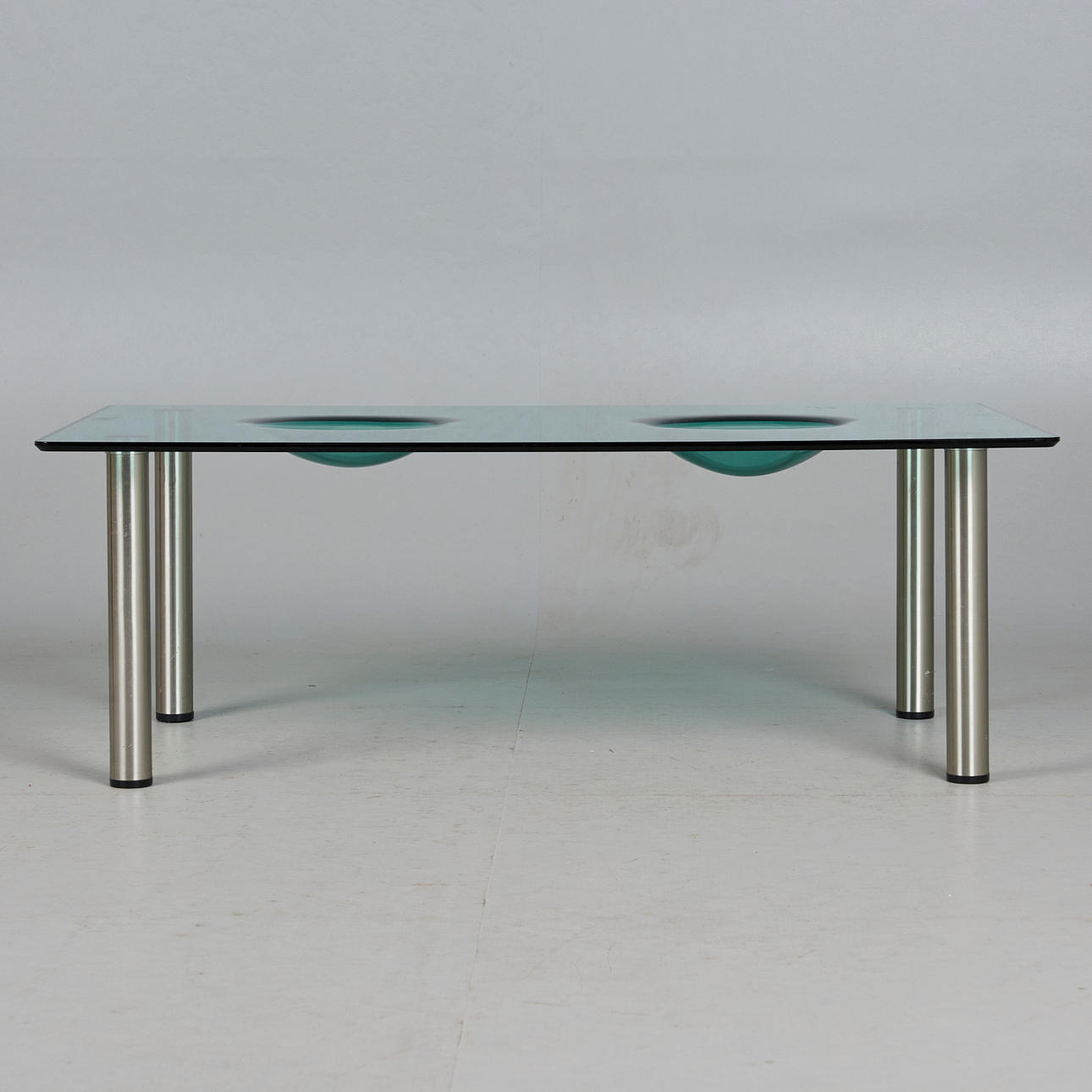 Glasbord / sidebord, stål, glas. Sidebord med fire cylindriske stålben og en rektangulær grøntonet glasplade med to afrundede flige, H.43cm, L.120cm, B.70cm.