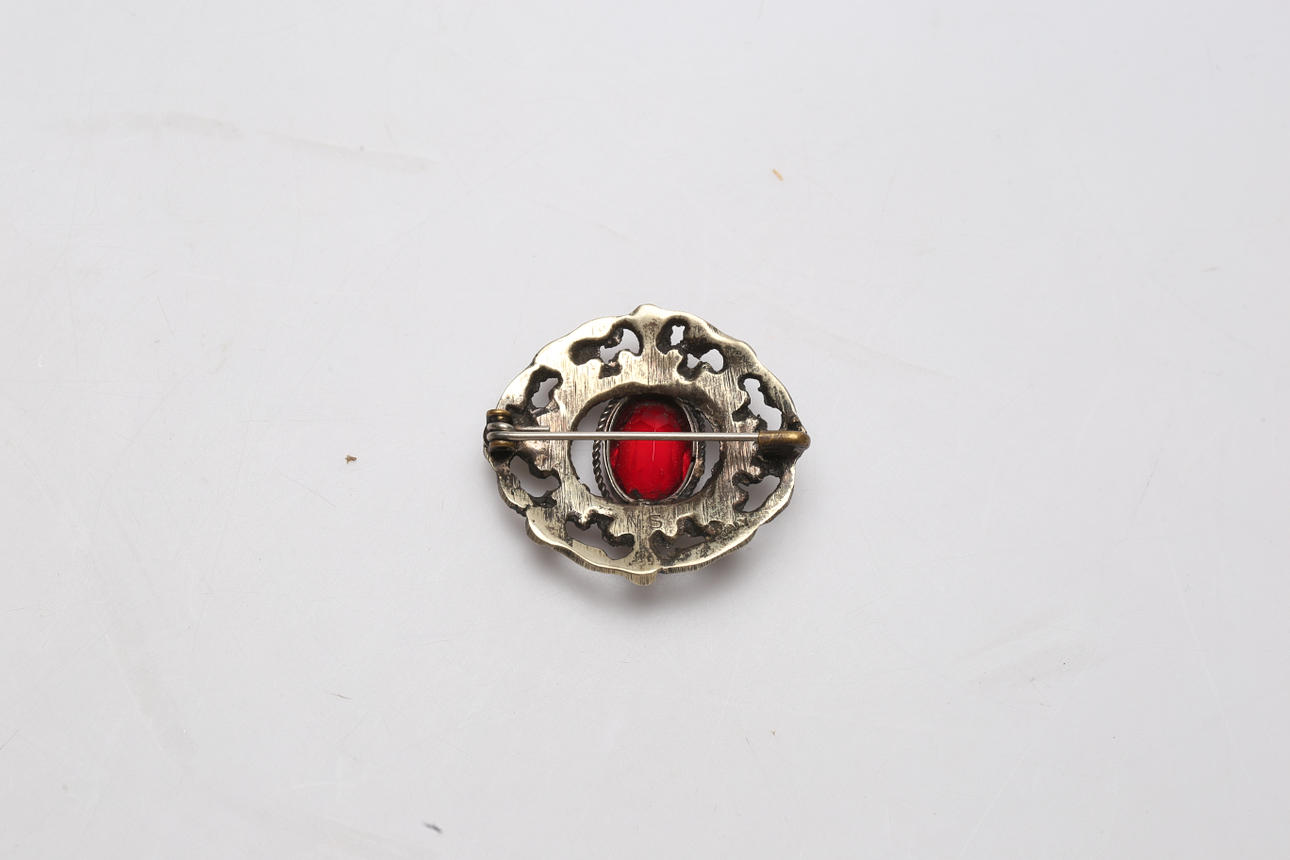 4x3 cm. Med rød sten.