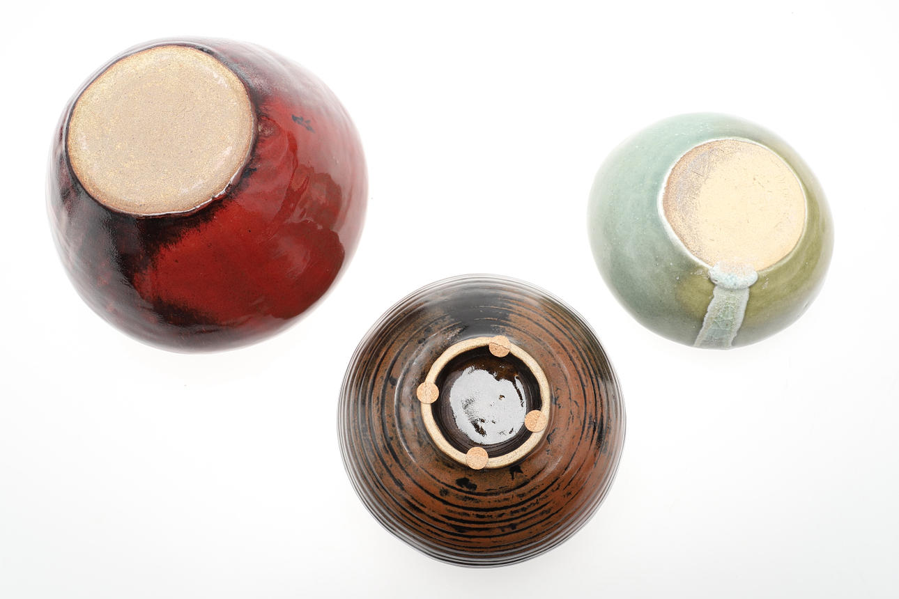 Den tredje med tenmoku over jernglasur med koncentrisk voksresist dekoration.