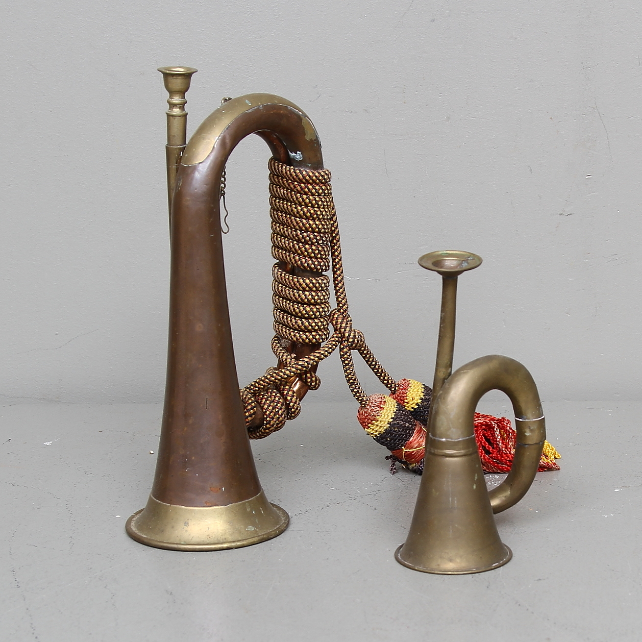 234061. BLÅSHORN, 2 stk, kobber og messing, 20. århundrede.