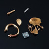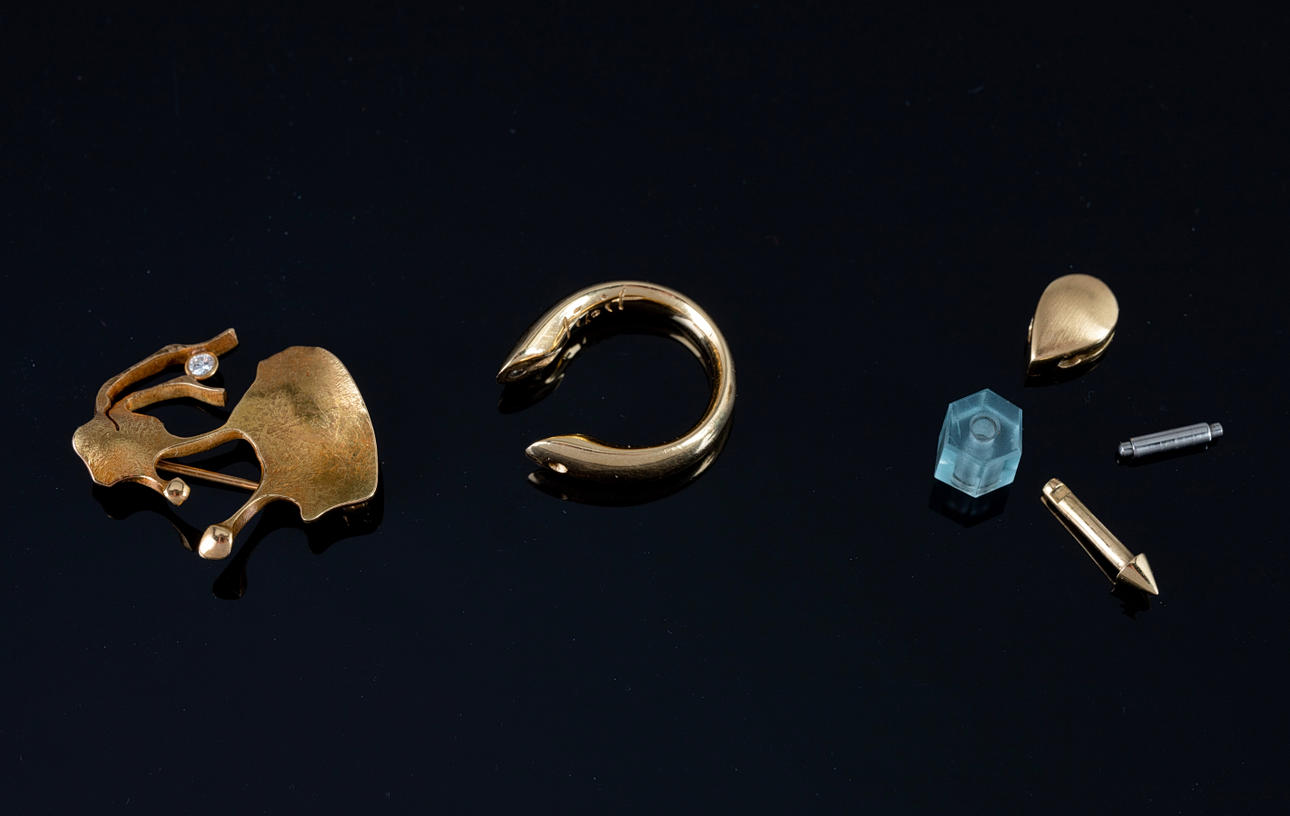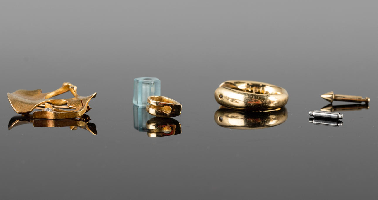 Blandet parti af 750 guld, bestående af 1 broche, 1 vedhæng, 1 ring (brudt), 1 piercing (ufuldstændig). mål ca. 1 cm - 3 cm.