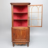 den øverste del med en støbt gesims over tre hylder omsluttet af en glaseret buet paneldør, den udragende base omsluttet af en paneldør, med et formet forklæde, på drejede ben, 89 cm bred x 50 cm dyb x 212 cm høj, med to nøgler.
