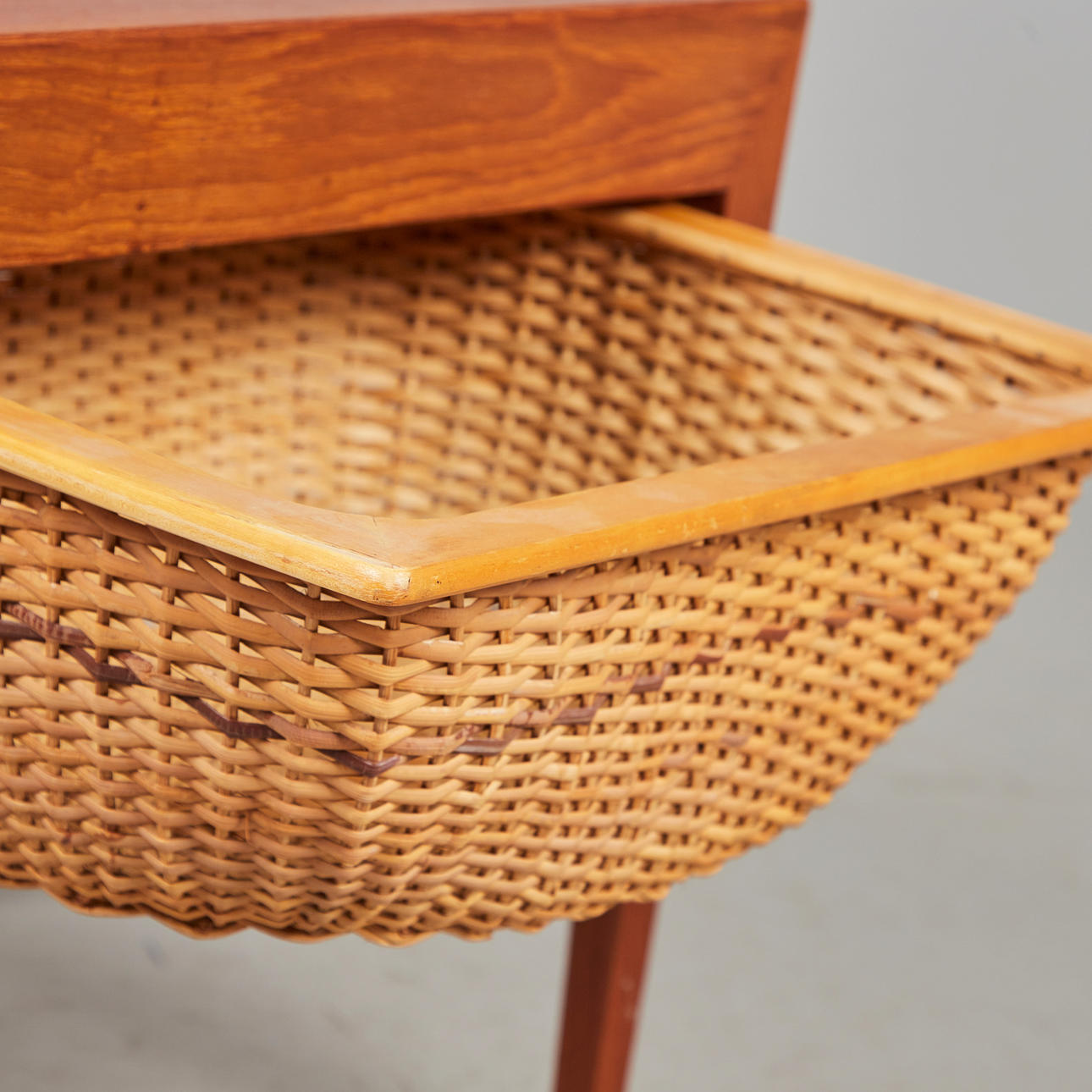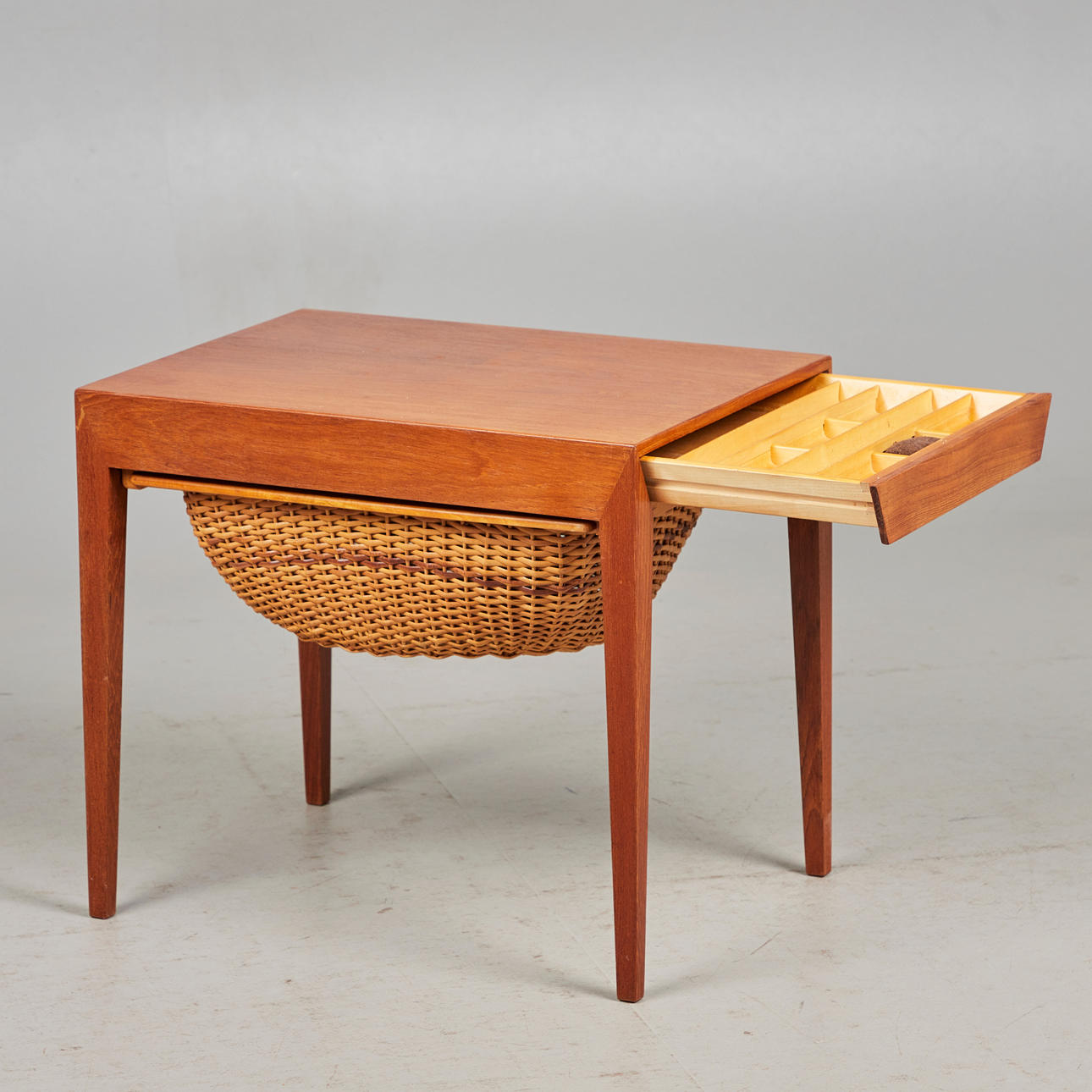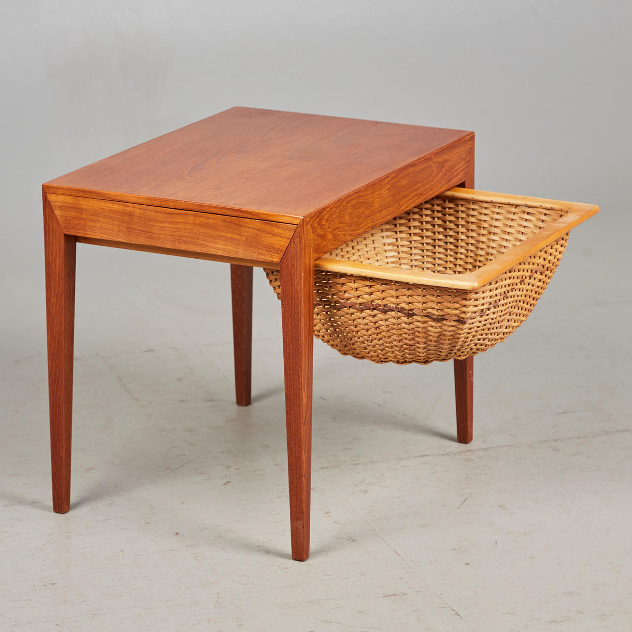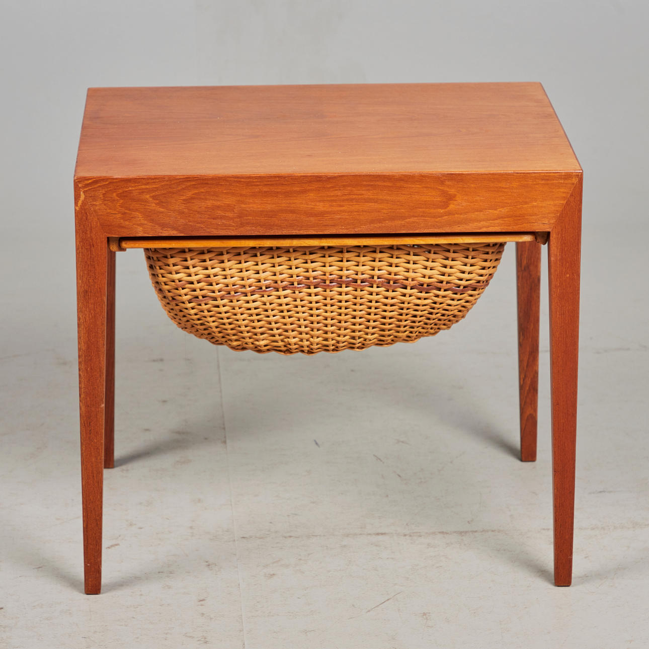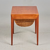 Severin Hansen for Central Møbler, syskab, teaktræ, flet, 1960'erne, Danmark. Rektangulært syskab af glaseret teak, udstyret med en fletskuffe nedenunder, med producentens etiket, H.52cm, L.58cm, B.43cm.