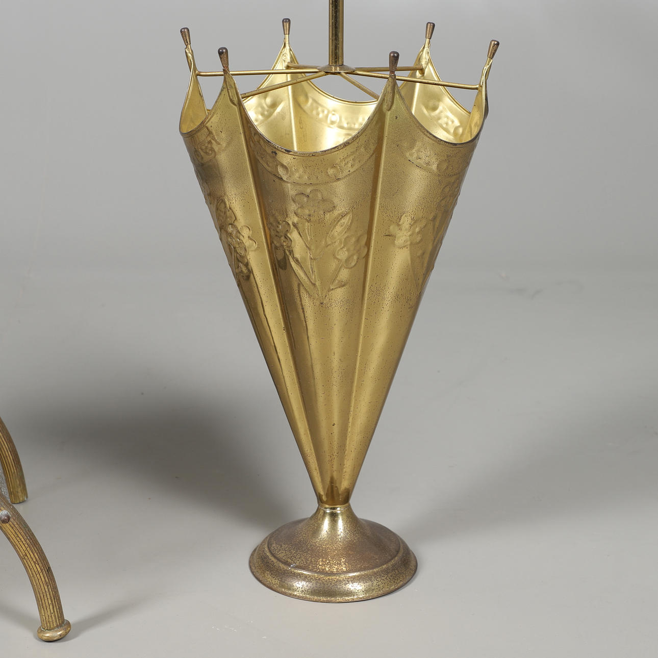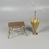 med X-ramme ben, 35 cm høj x 45 cm bred x 31 cm dyb, og et messing paraply stativ, håndtaget i form af et hundehoved håndtag, 71 cm højt.
