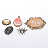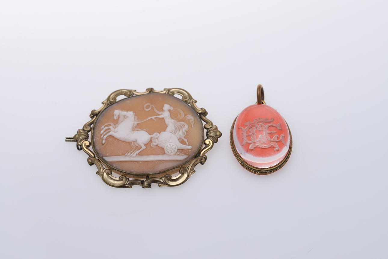 En shell cameo broche, der forestiller Aurora, der kører en stridsvogn og heste, indestinkt signatur at vende, i forgyldt montering 7 cm, en citrin broche, et victoriansk omvendt dybtryk vedhæng og 2 yderligere brocher.