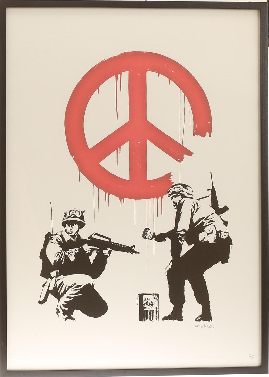 BANKSY (efter) „CND Soldiers” offset litografi, arkstørrelse 70 x 50 cm, trykt skilt i tryk nederst til højre, nummereret nederst til højre med blyant, prægningsstempler, bomuldspapir.