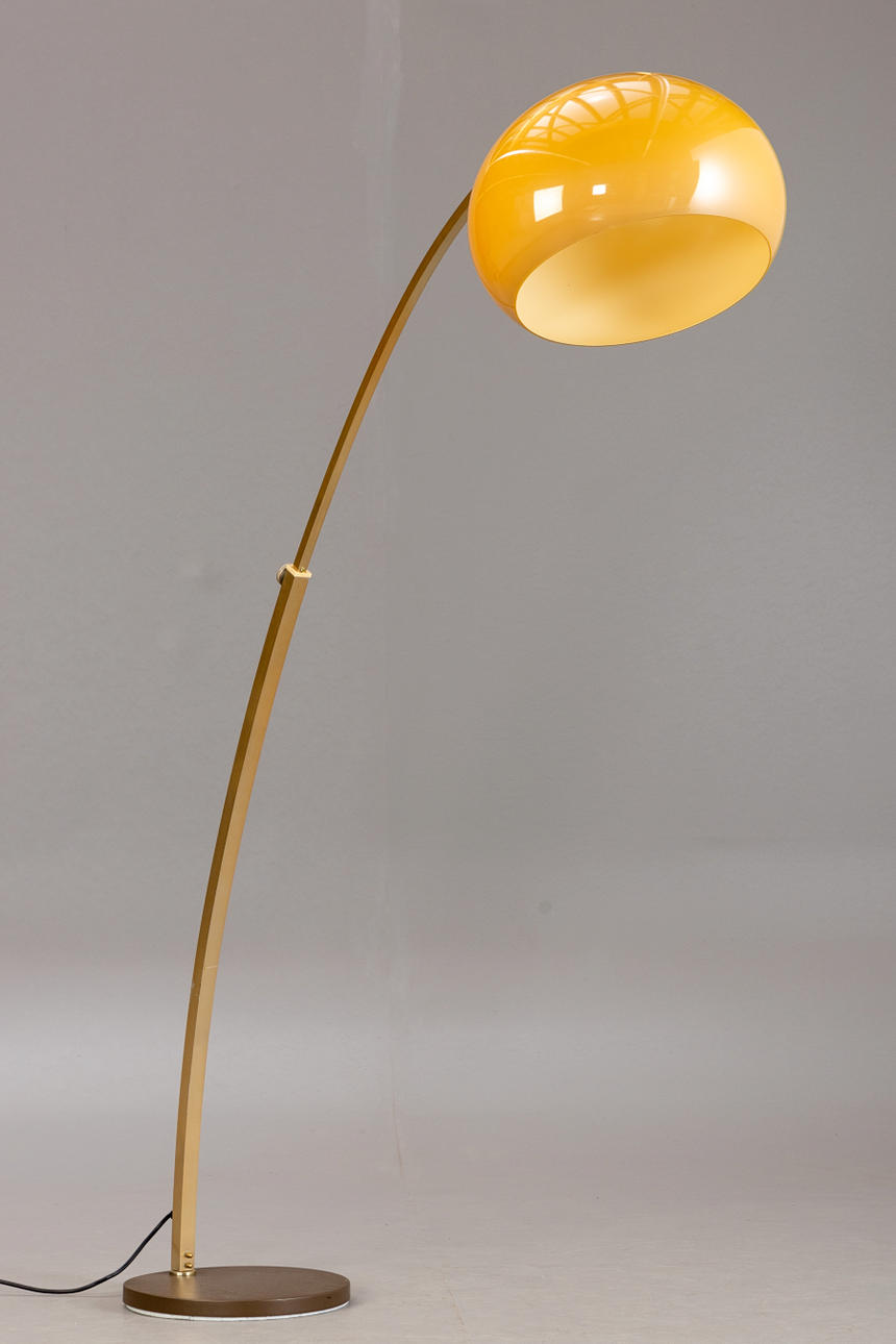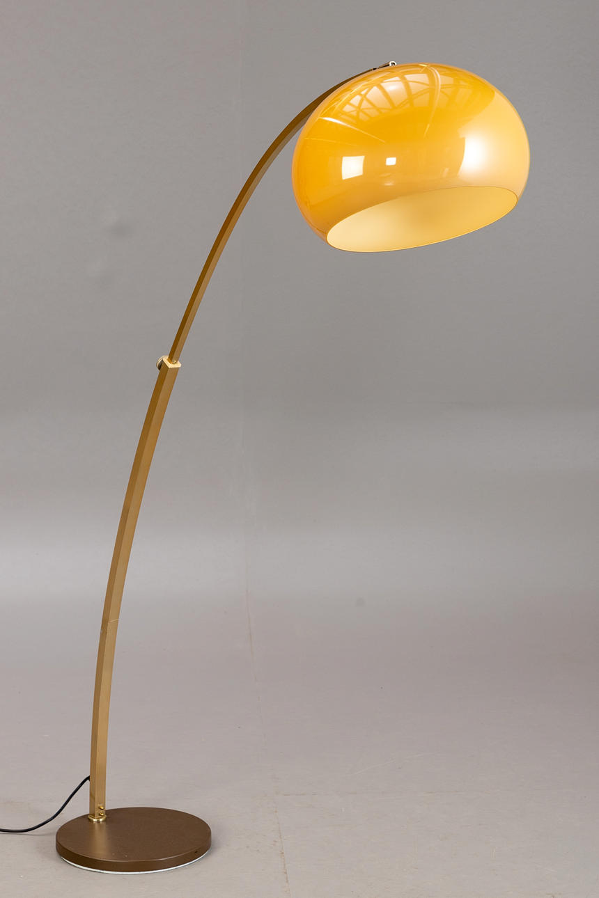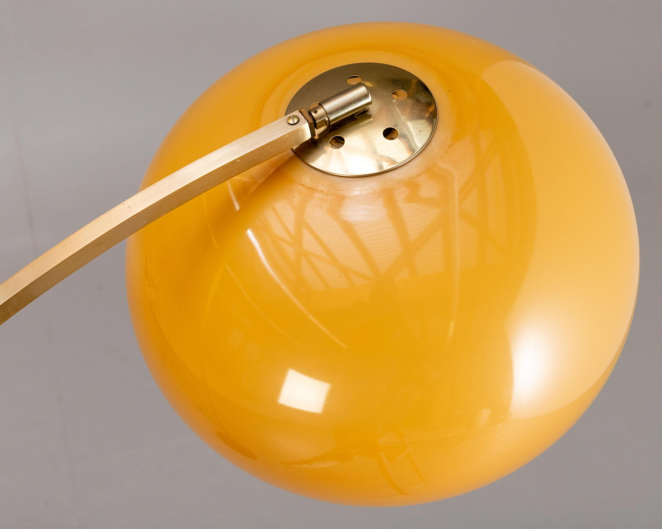 Buelampe fra 1970'erne. Buelampe med teleskoplampe i firkantet metal. Plast lampeskærm Ø 40 cm. 1 brænder, E27 fatning. Rund lampefod Ø 35 cm.