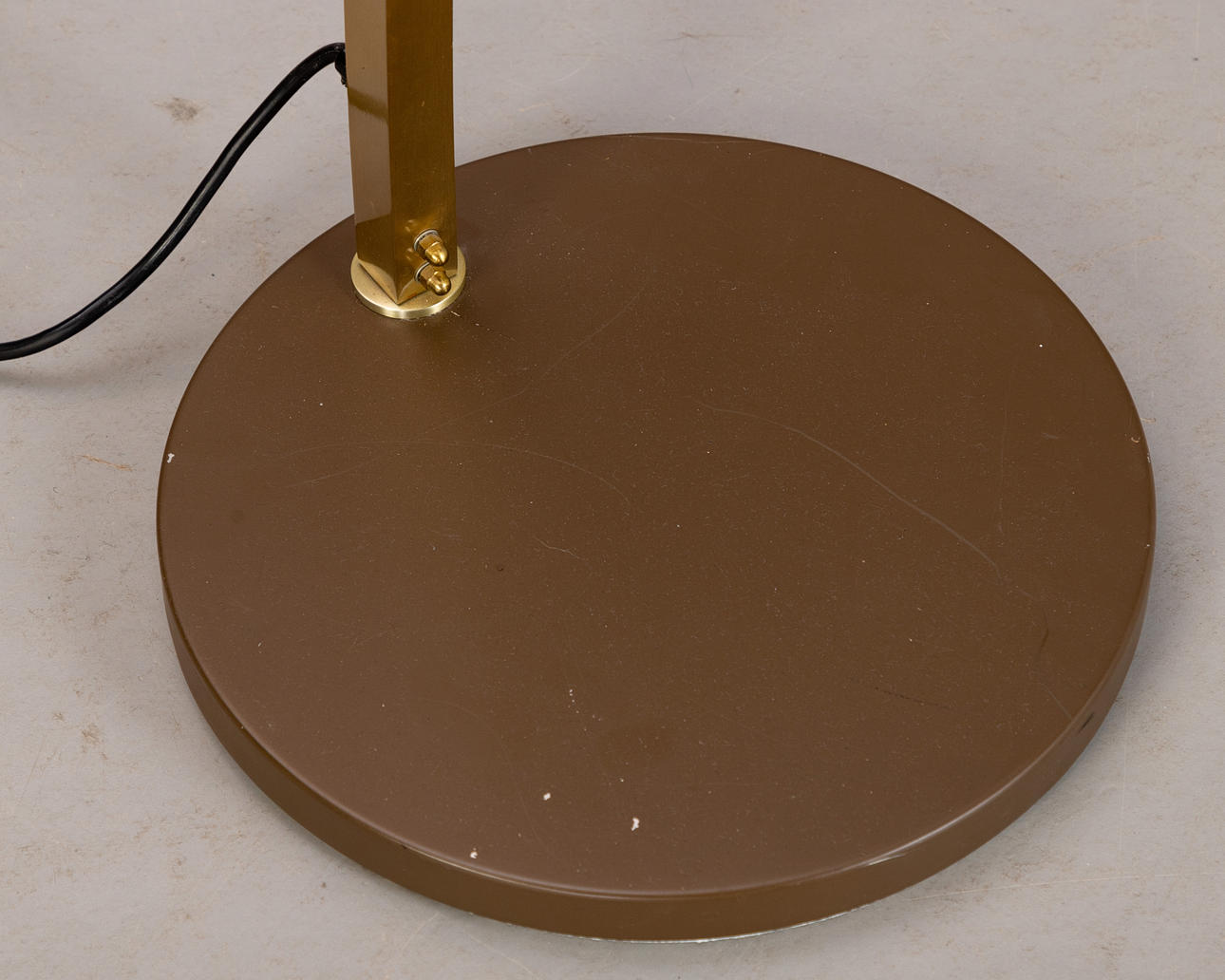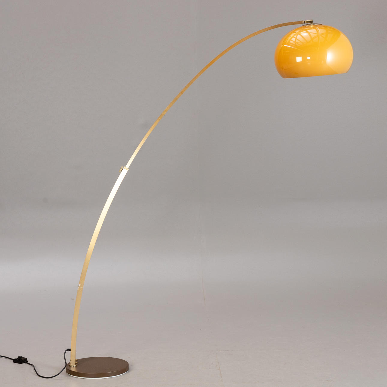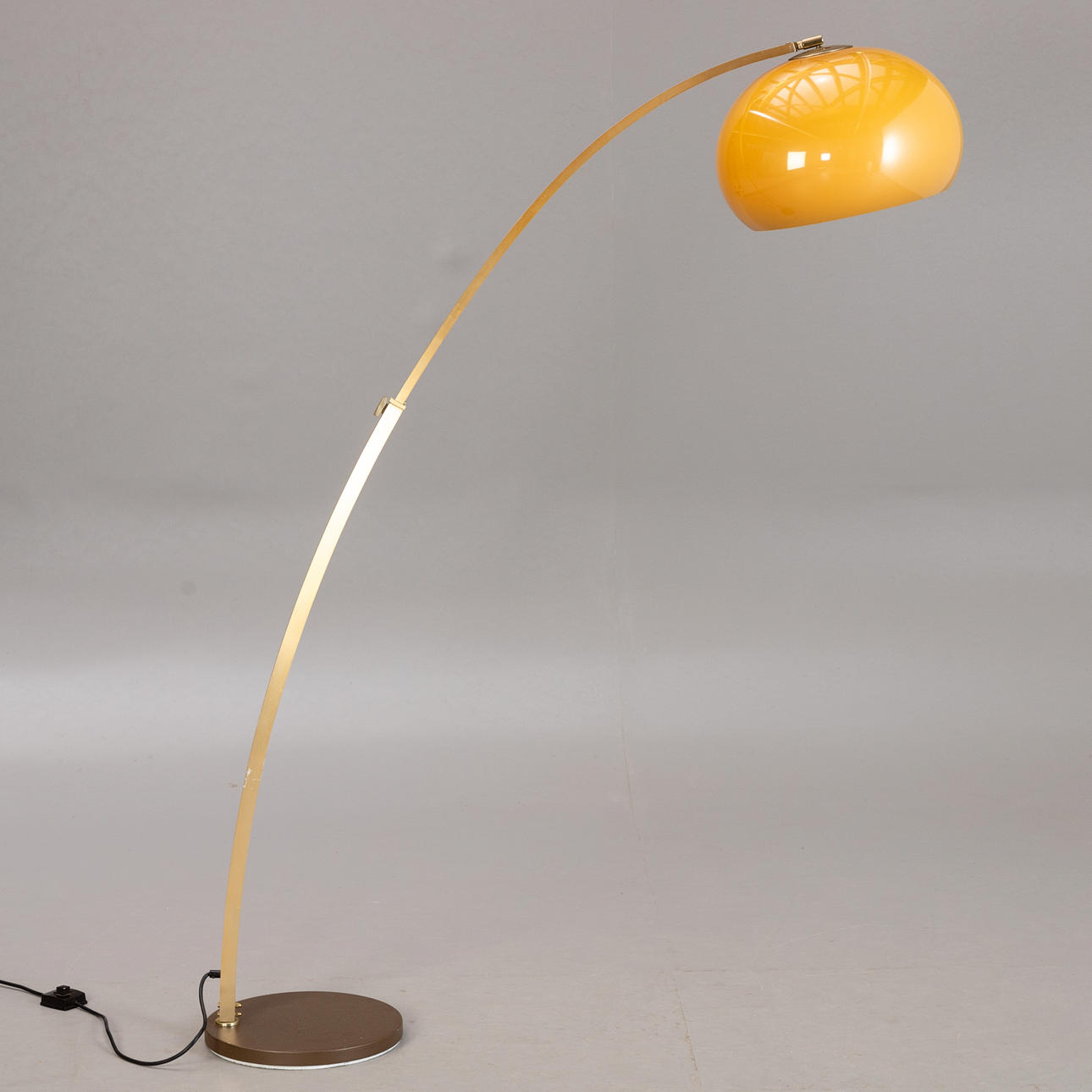 Buelampe fra 1970'erne. Buelampe med teleskoplampe i firkantet metal. Plast lampeskærm Ø 40 cm. 1 brænder, E27 fatning. Rund lampefod Ø 35 cm.