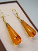 Rav dråber i harmoniske proportioner og med naturlige indeslutninger er fleksibelt ophængt, længde 4,3 cm, bredde 0,9 cm Rav dråber ca. 27 mm x 9 mm, vægt 2,9 gram.