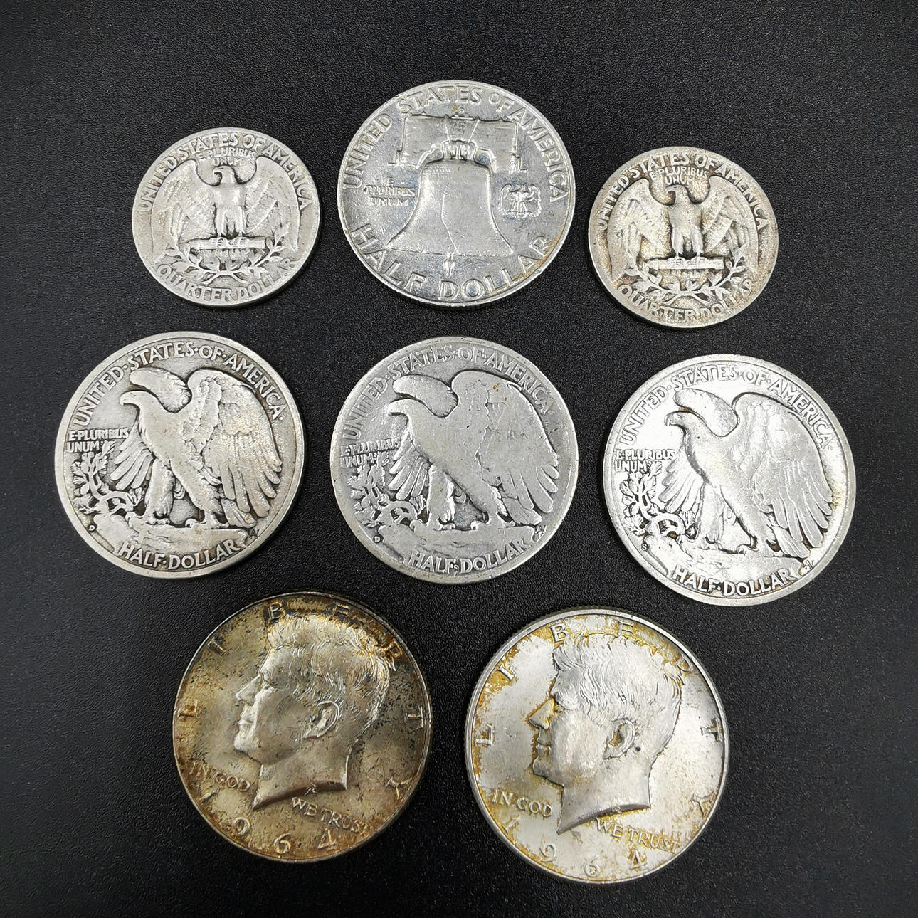 Denne samling af amerikanske mønter består af seks Half Dollar-mønter og to Quarter Dollar-mønter.