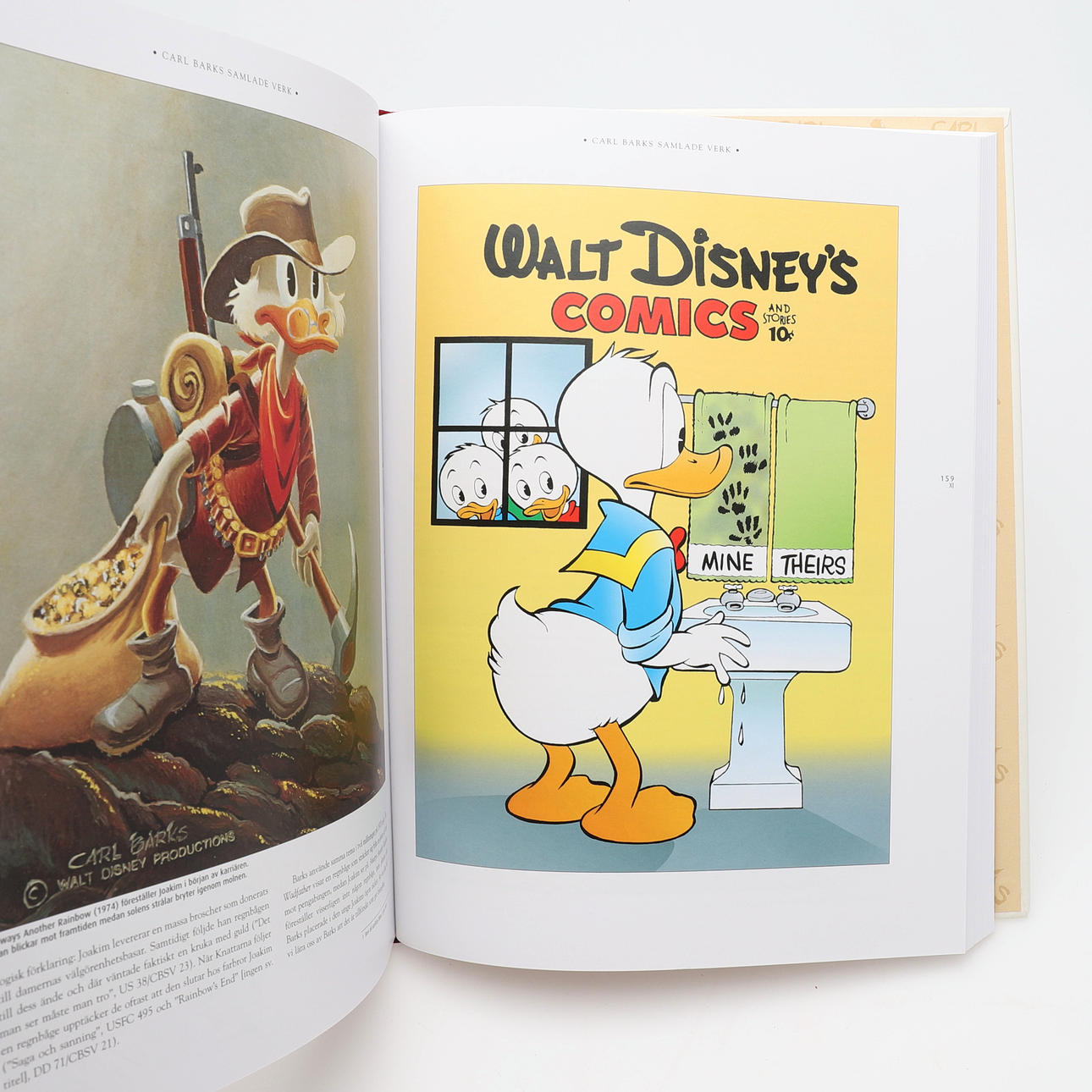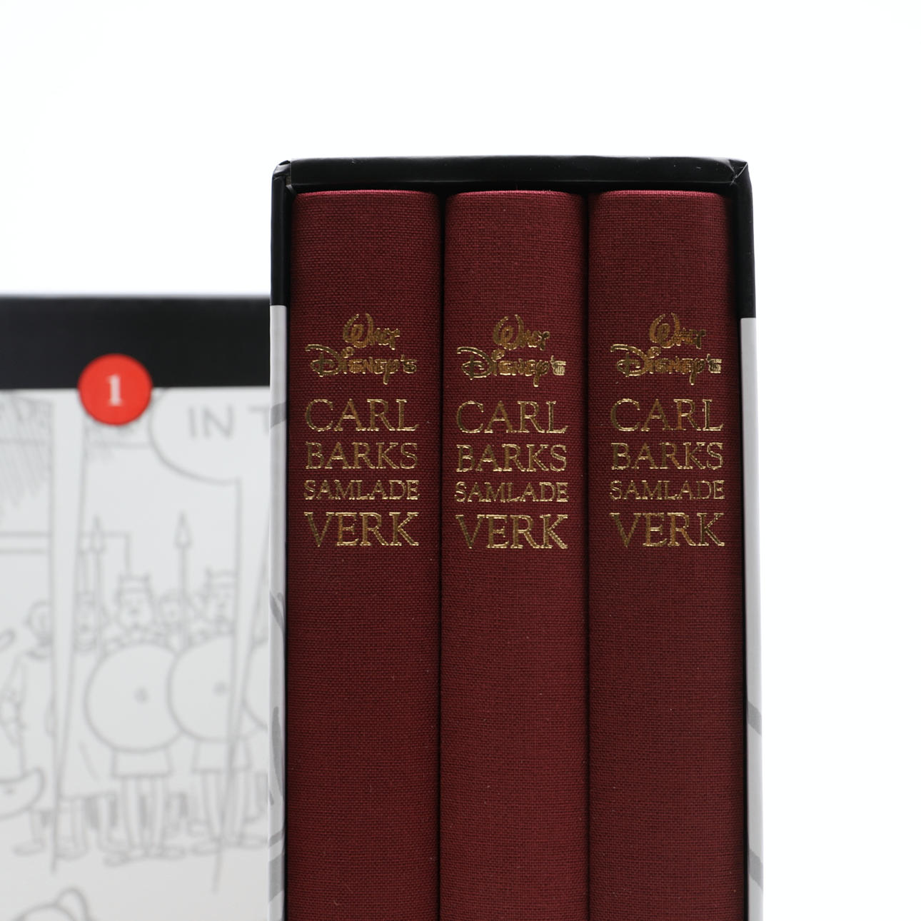 Bark, Carl, amerikansk tegneserieskaber og kunstner, (1901-2000). Carl Barks samlede værker I-XXX (30 vol. + Grafik mappe + Ejerskabsbevis. Egmont Kärnan, Malmø, 2005-2008. Oplag 2000 eks. 30 store 4:o bind i forlagets bordeaux stofrygbind med illustreret foromslag. Opbevares i 10 illustrerede kassetter. Grafikmappen i lidt større format.