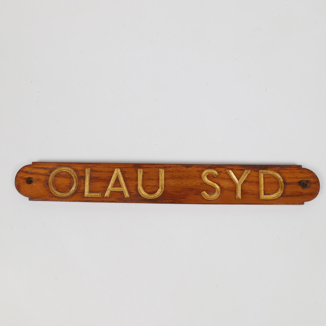 2413298. BÅDESKILT, "Olau Syd", træ, 1900-tallet.
