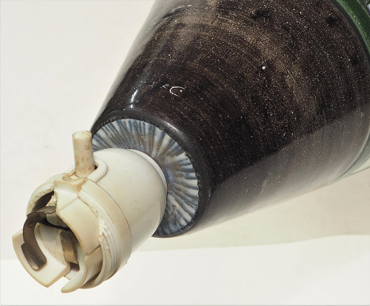 Brugstilstand. Lampeholder i stykker. Glasur glider og overfladesnavs.