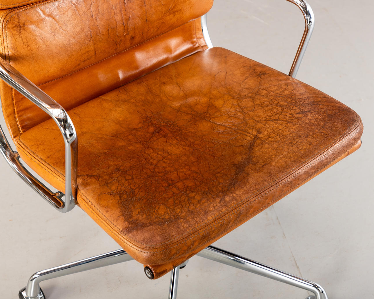'EA 219' kontorstol fra Ray & Charles Eames til Vitra. Cognacfarvet blød læderpude, forkromet stel, justerbar sædehøjde.