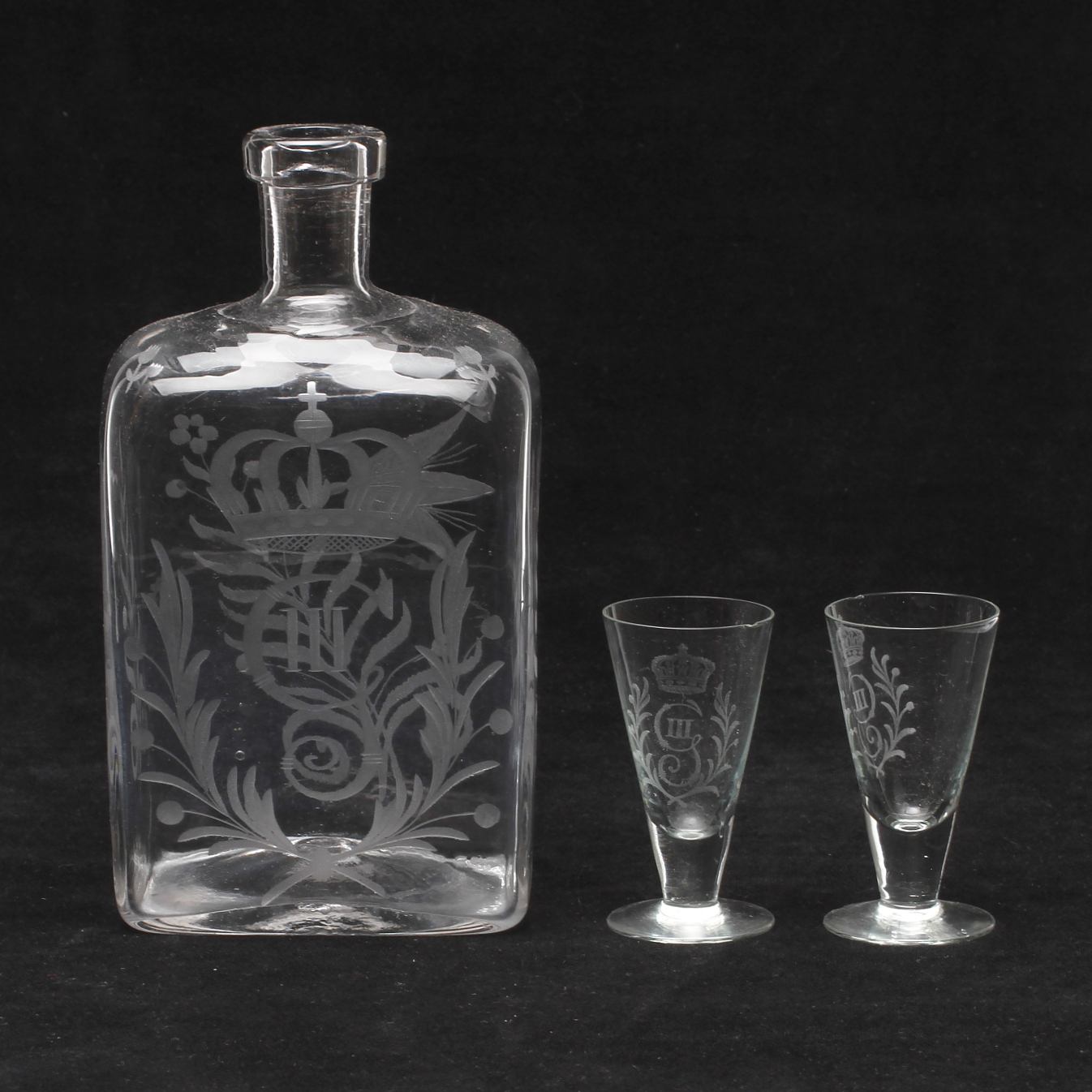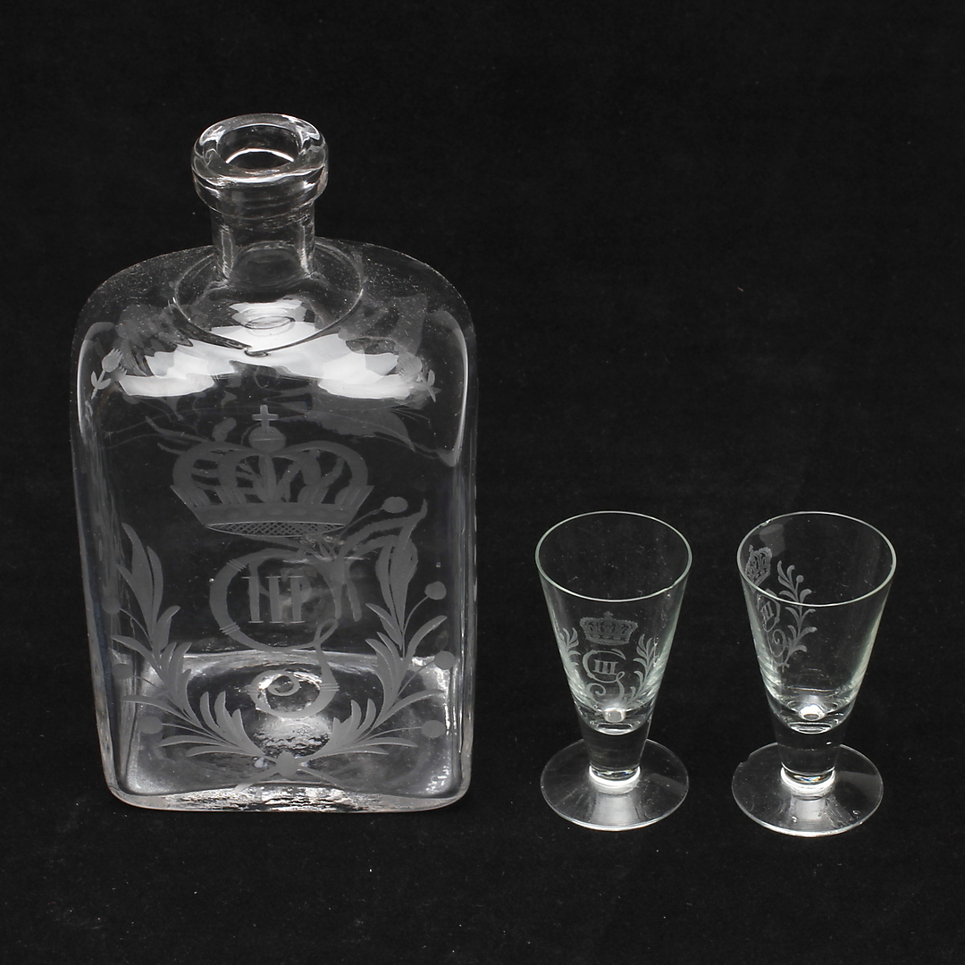 241725. FLASKE og SNAPGLAS, 2 stk, glas, 20. århundrede.