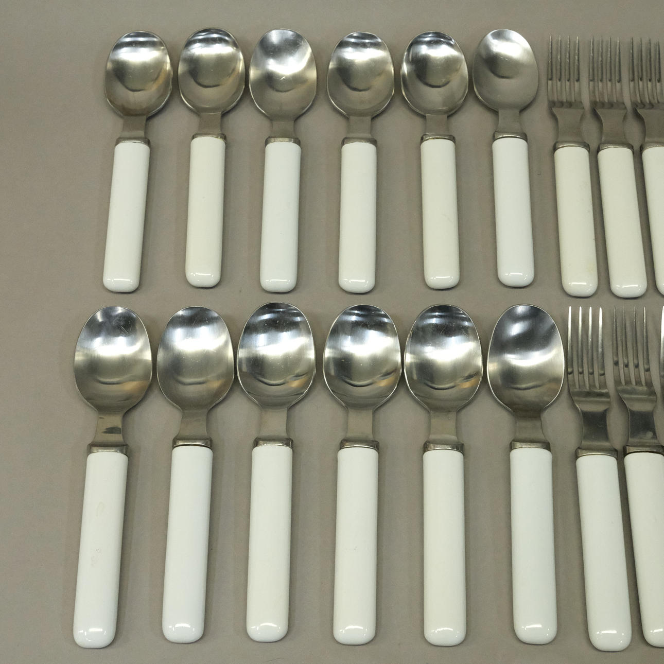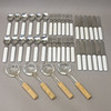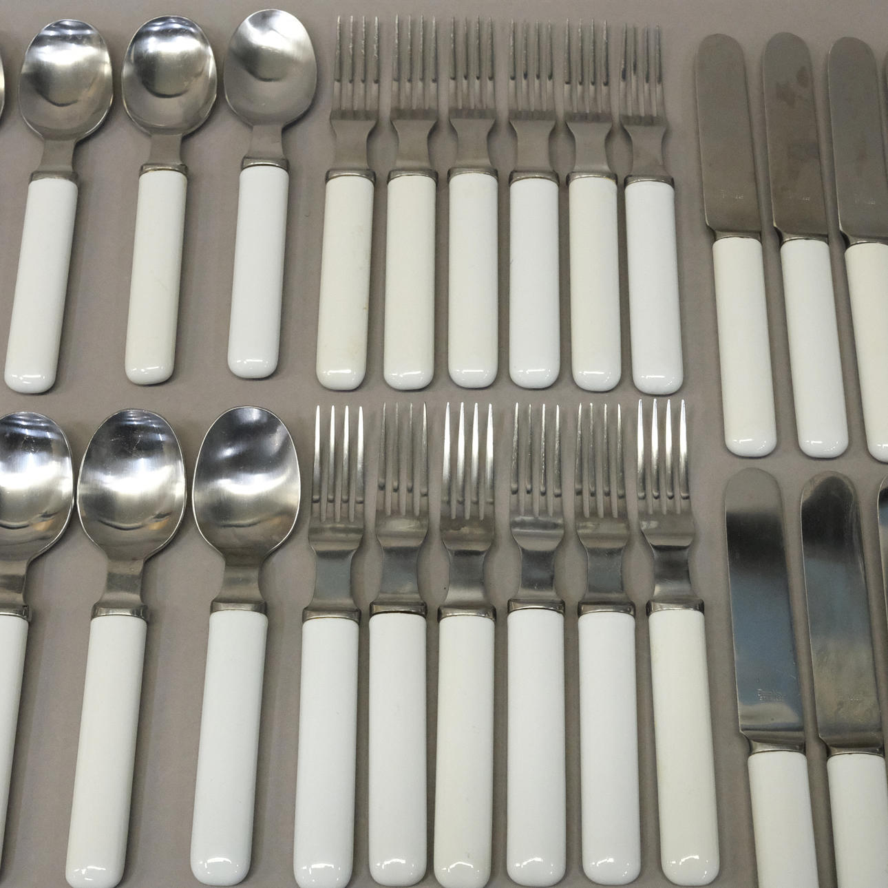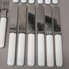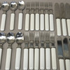 Bestik i metal og porcelæn: 12 gafler, 12 knive og 12 skeer, længde 8-22 cm og 4 glas serveringsskeer med korkskaft, længde 24 cm.