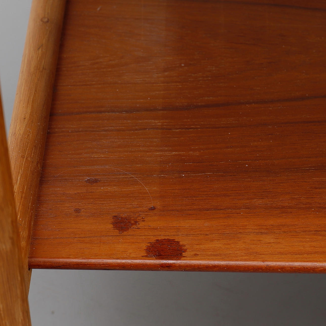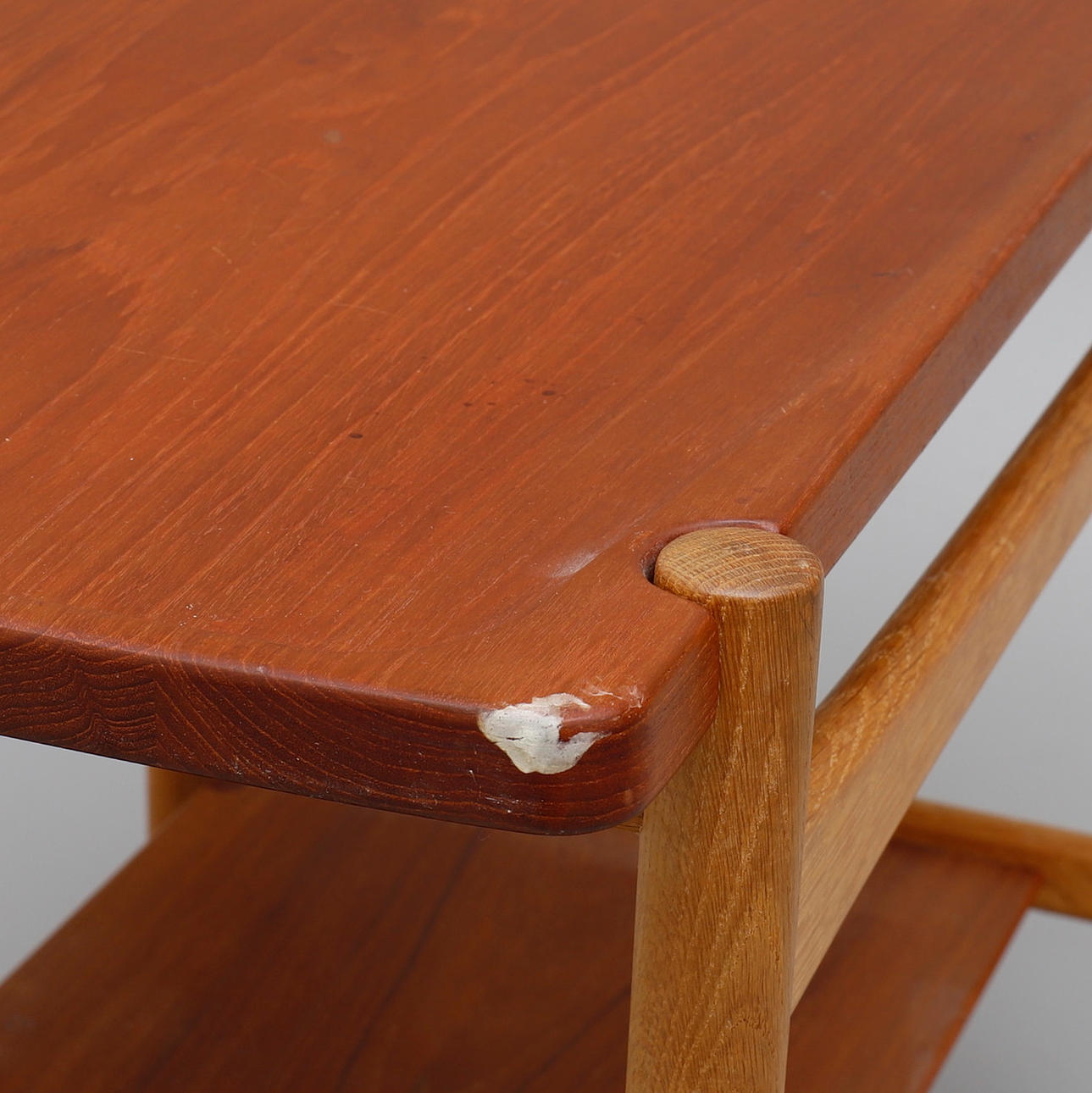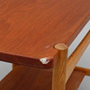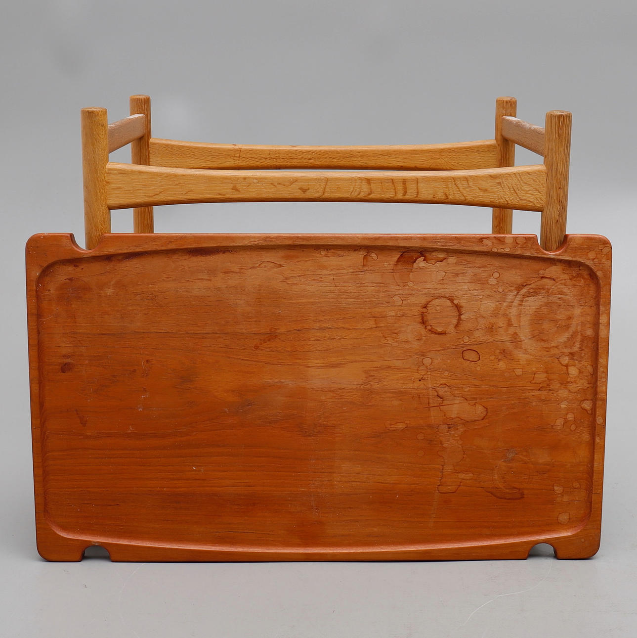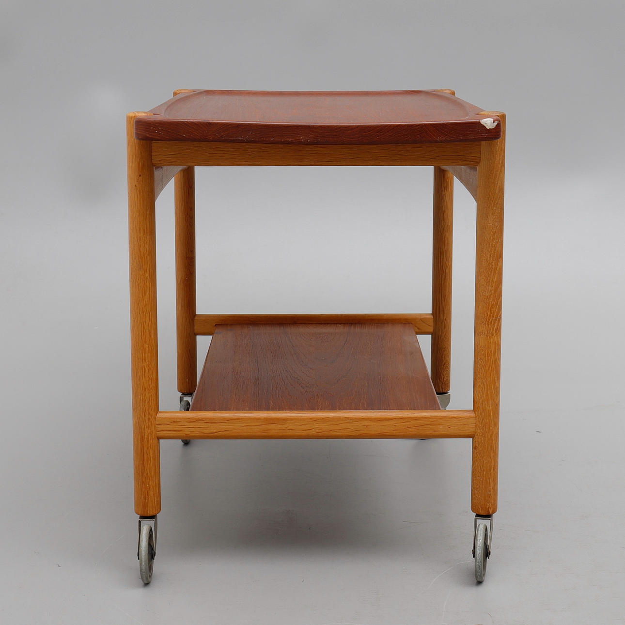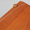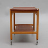 Teak og eg, med vendbar bakke, højde 60 cm, længde 77 og bredde ca 47 cm.