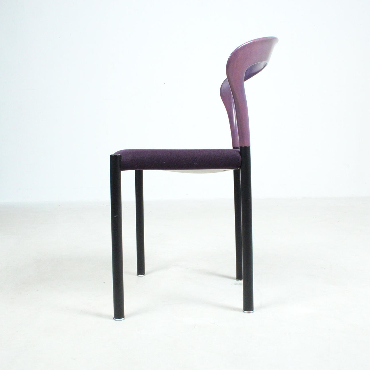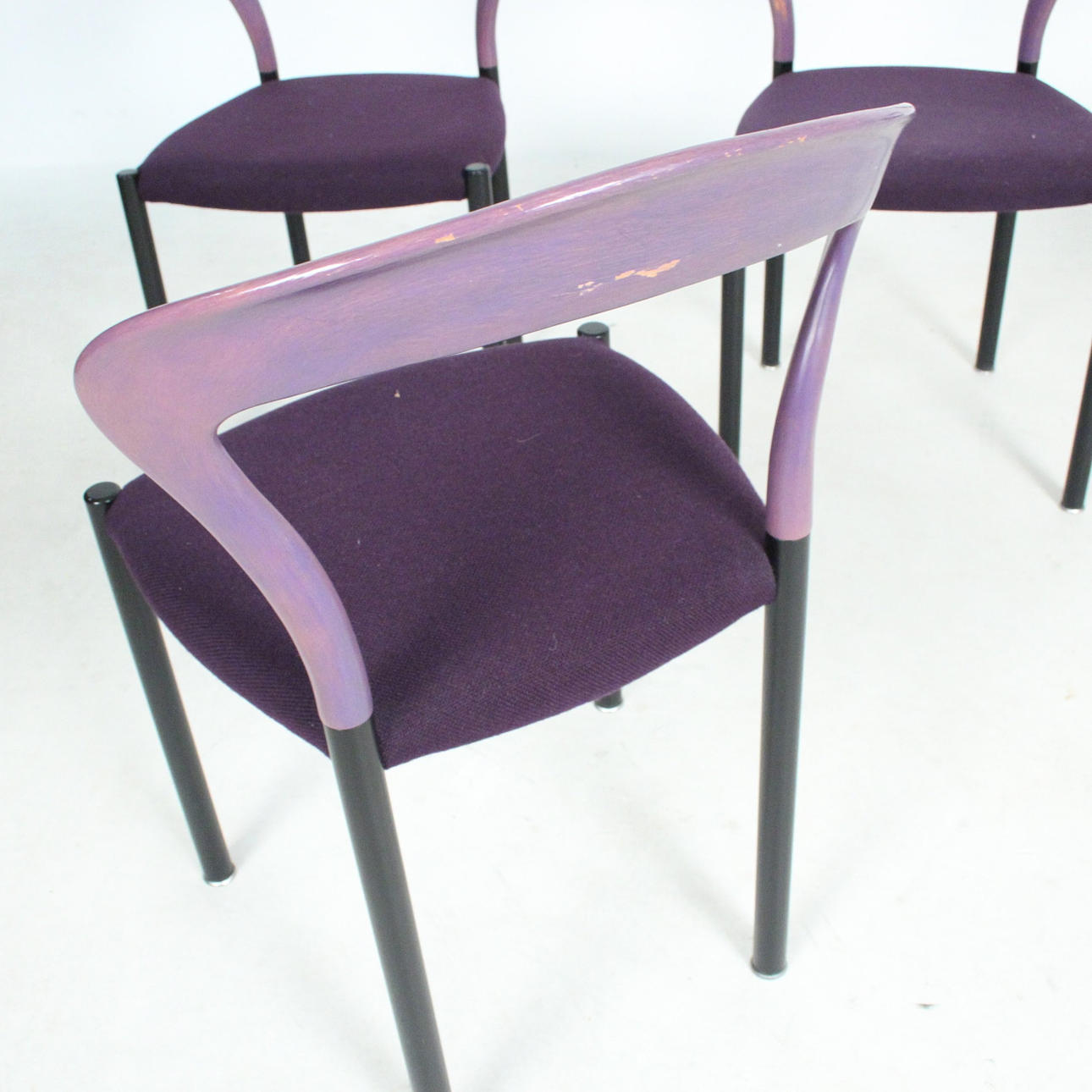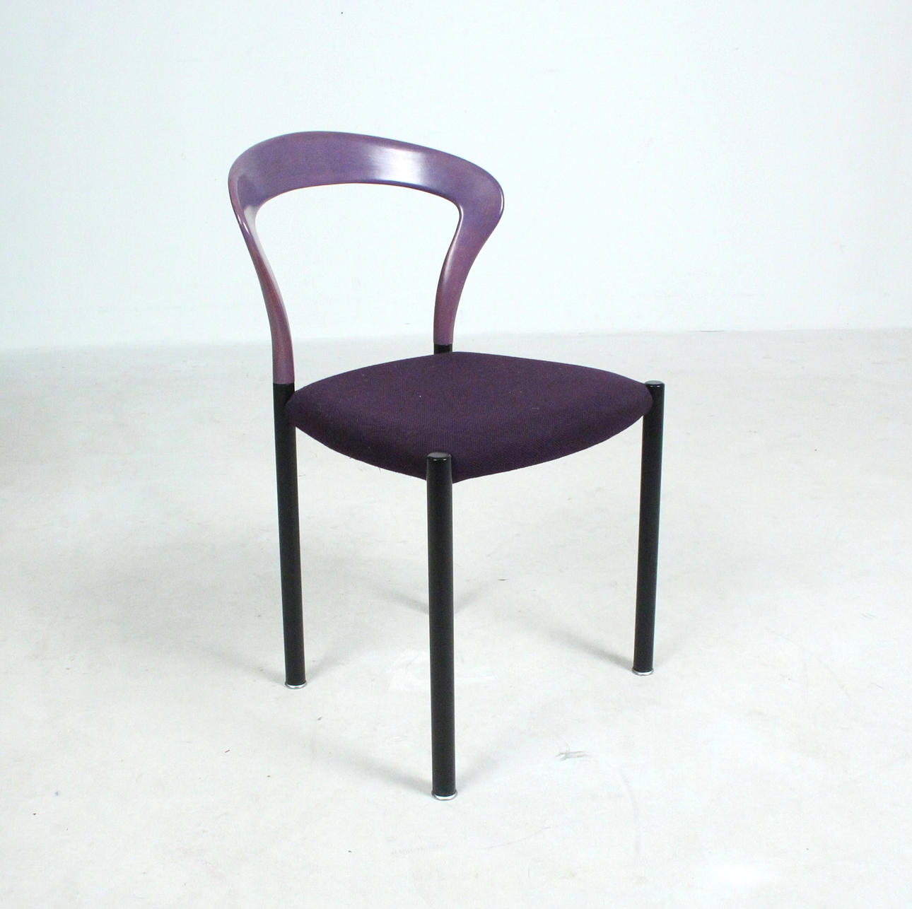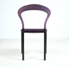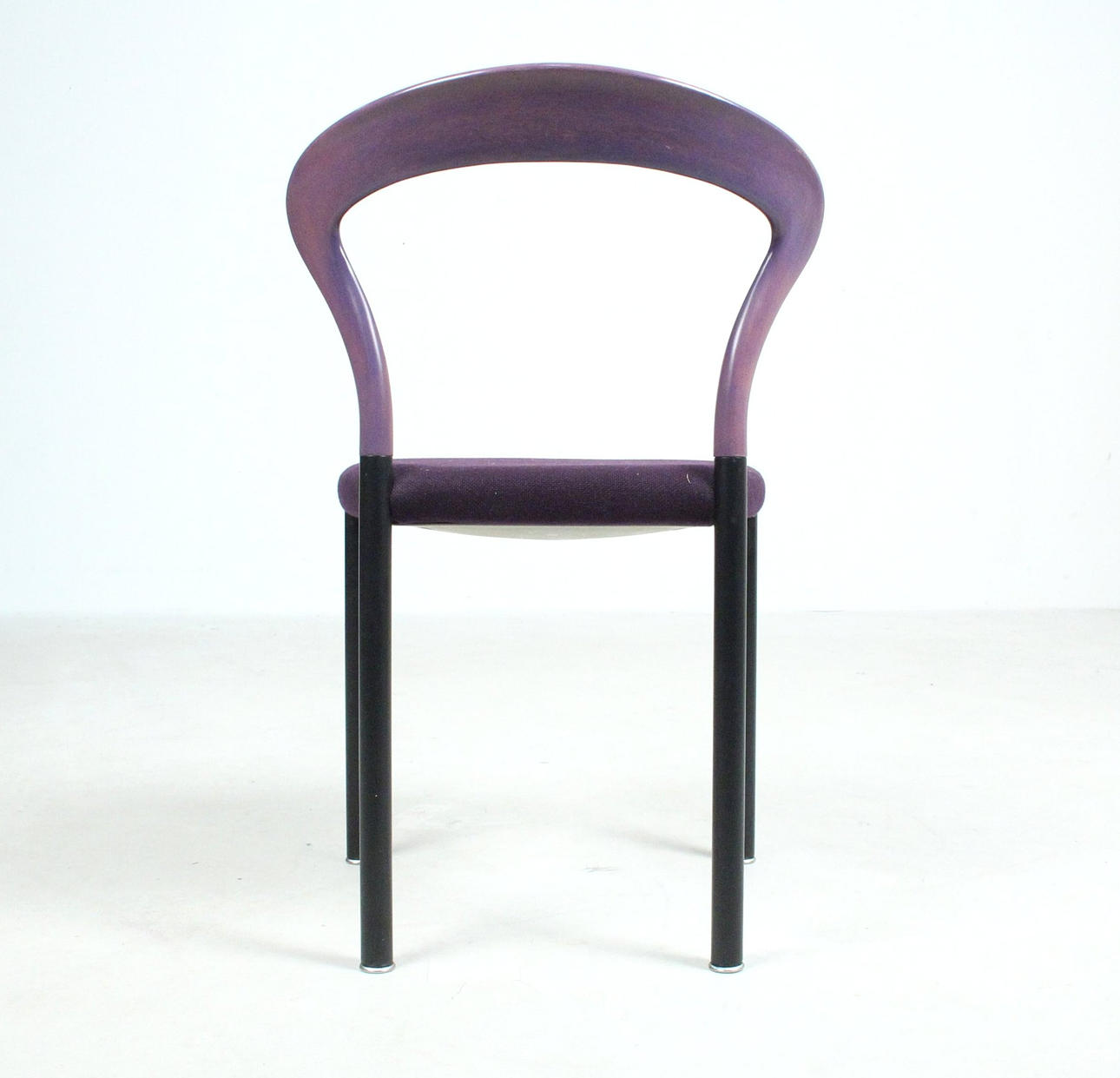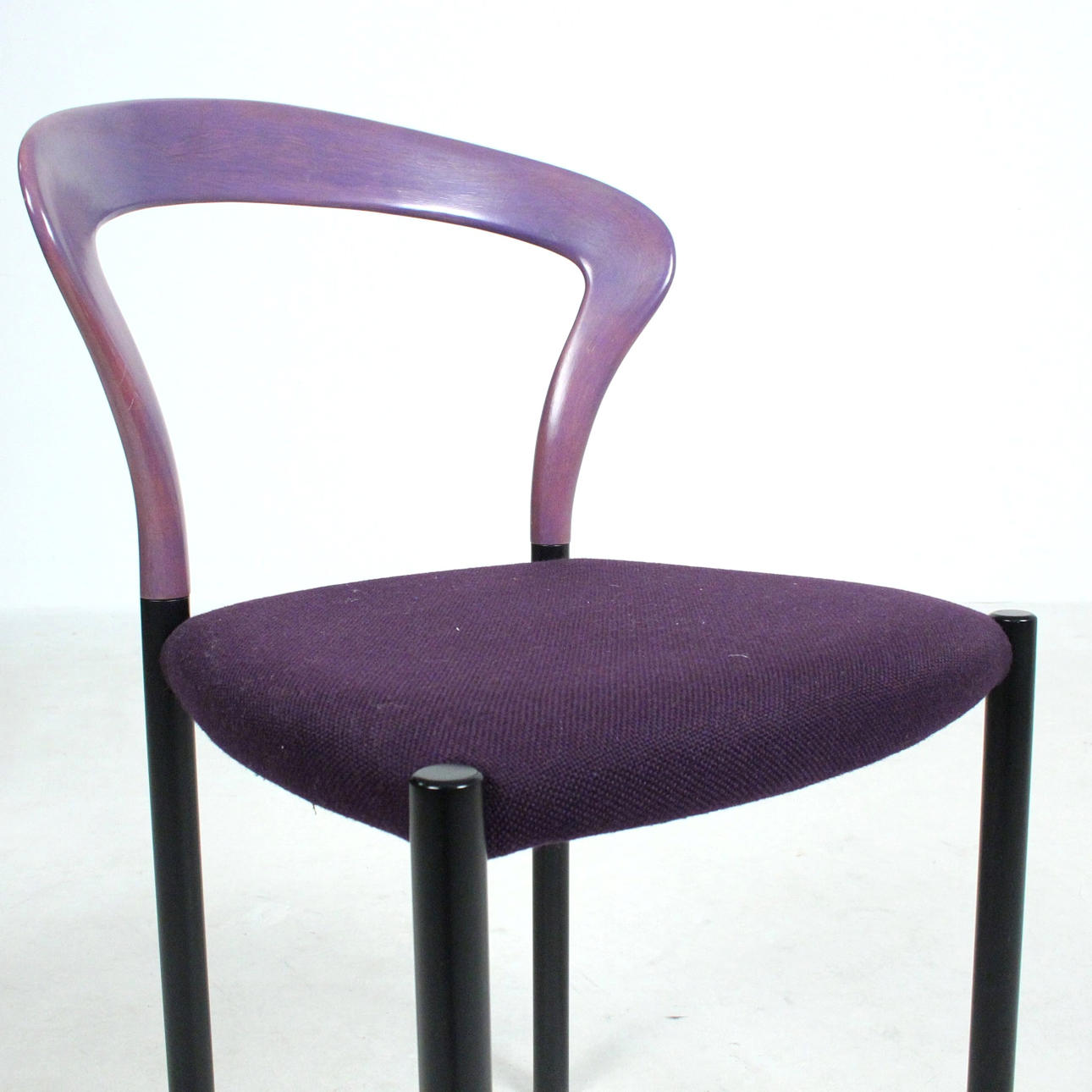 Materiale: bøgetræ malet violet, stålrør malet mat sort, fladt tekstilstof i en humlesæks kvalitet (ca. RAL4007 lilla ), fodstøtter i forkromet metal, sædeskal af plast.