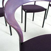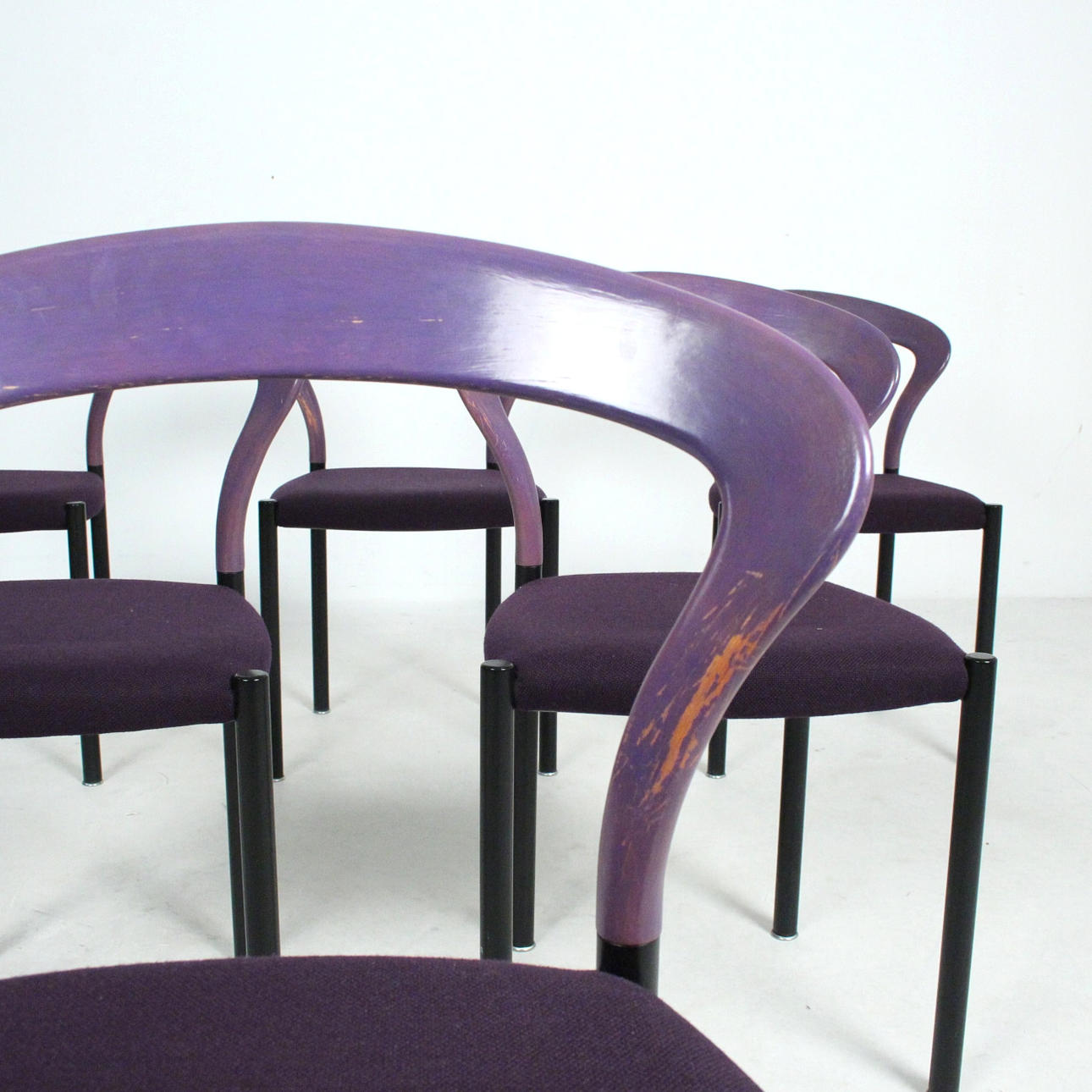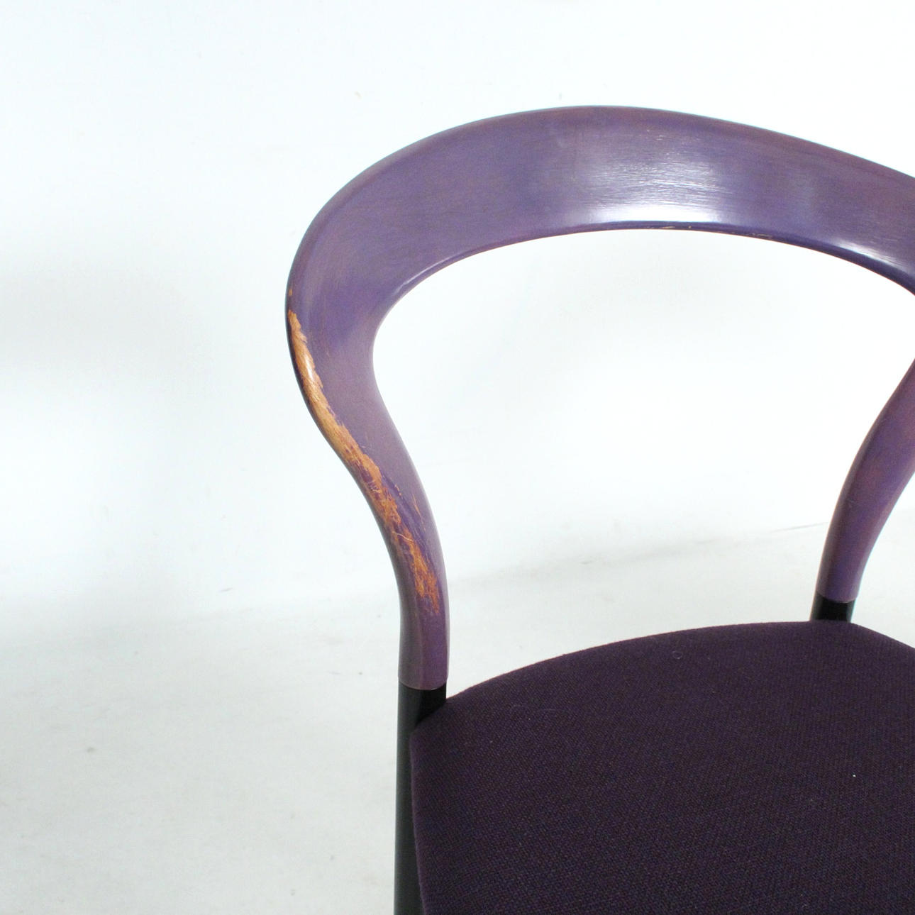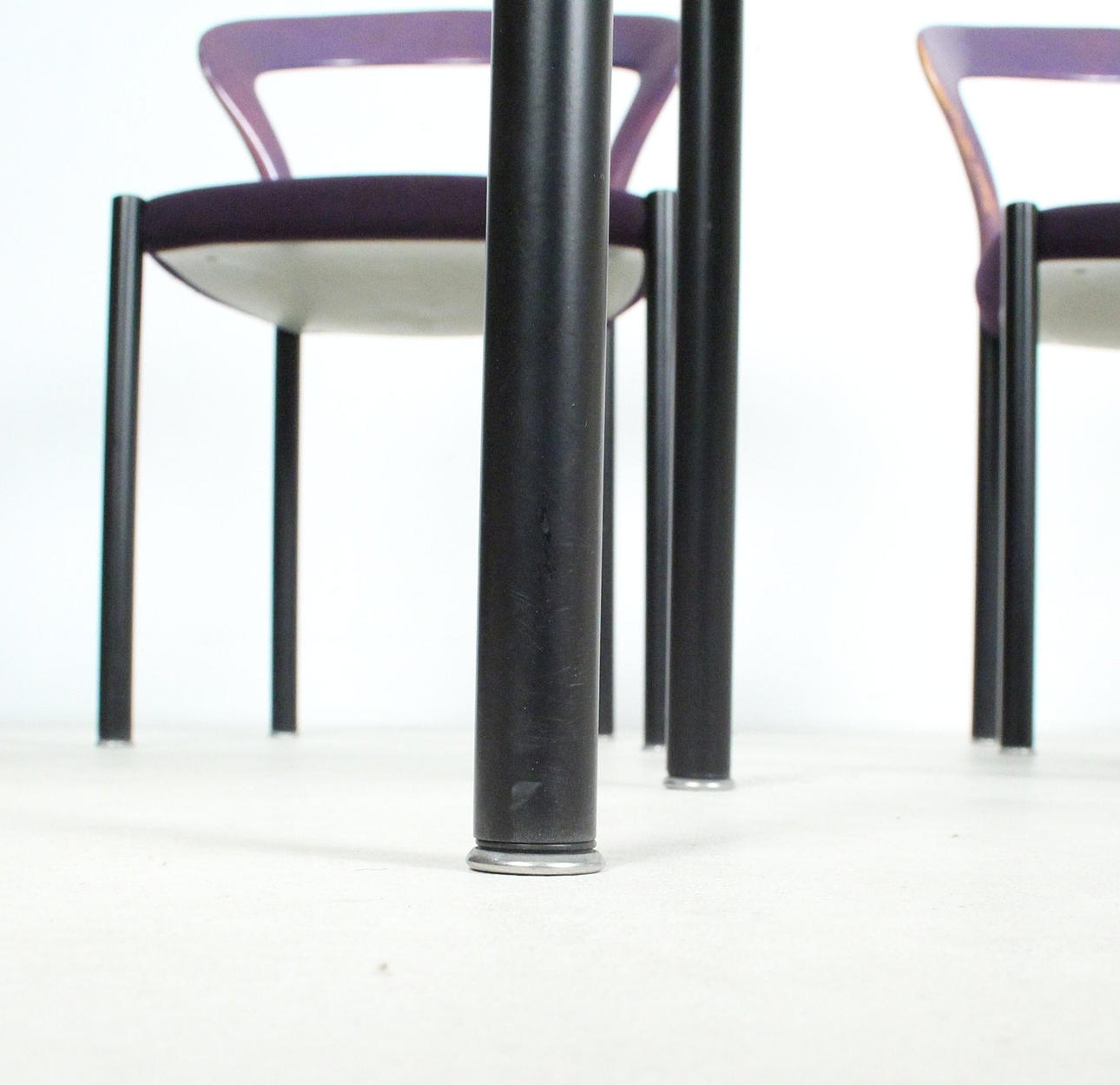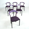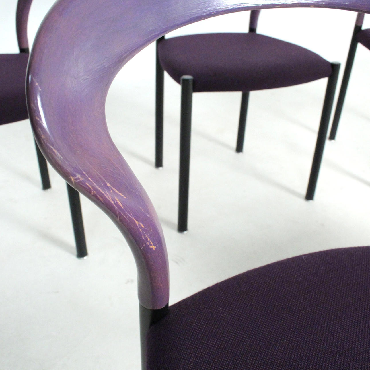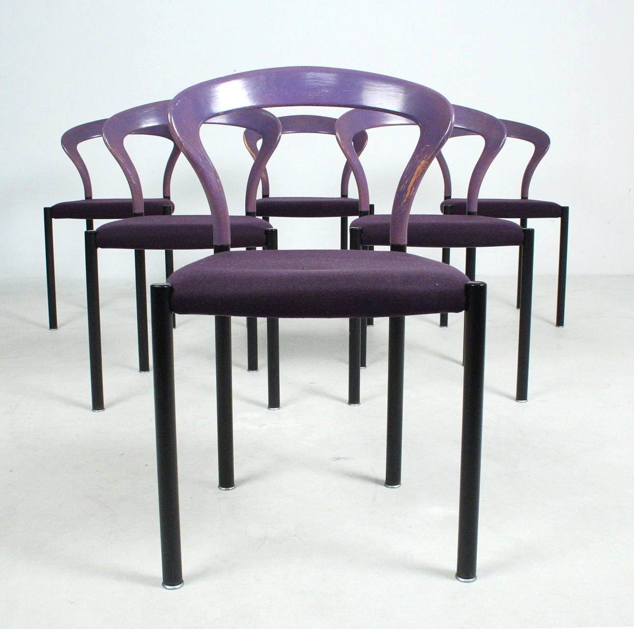 Materiale: bøgetræ malet violet, stålrør malet mat sort, fladt tekstilstof i en humlesæks kvalitet (ca. RAL4007 lilla ), fodstøtter i forkromet metal, sædeskal af plast.