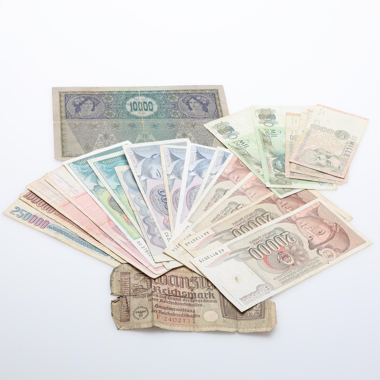 Sedler Svensk pålydende værdi 795 SEK Mønt sølv fint sølv vægt ca 453 gram udenlandske pengesedler fra Jugoslavien, Tyrkiet, Italien mm.