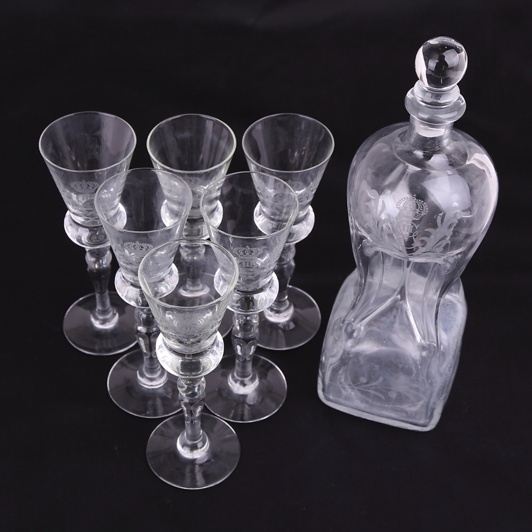 247013. UR FLASKE med 6 SNAPS GLAS, monogram Gustaf III.