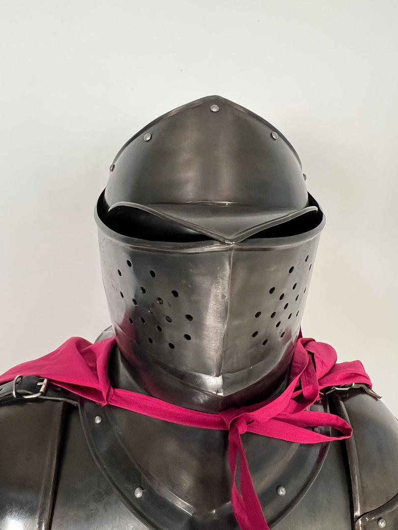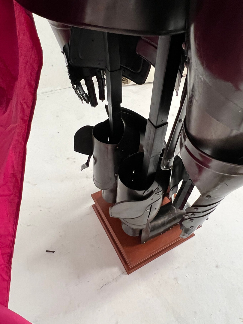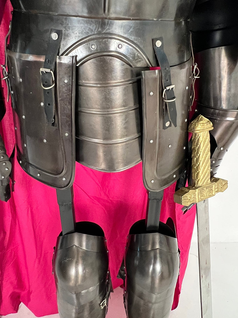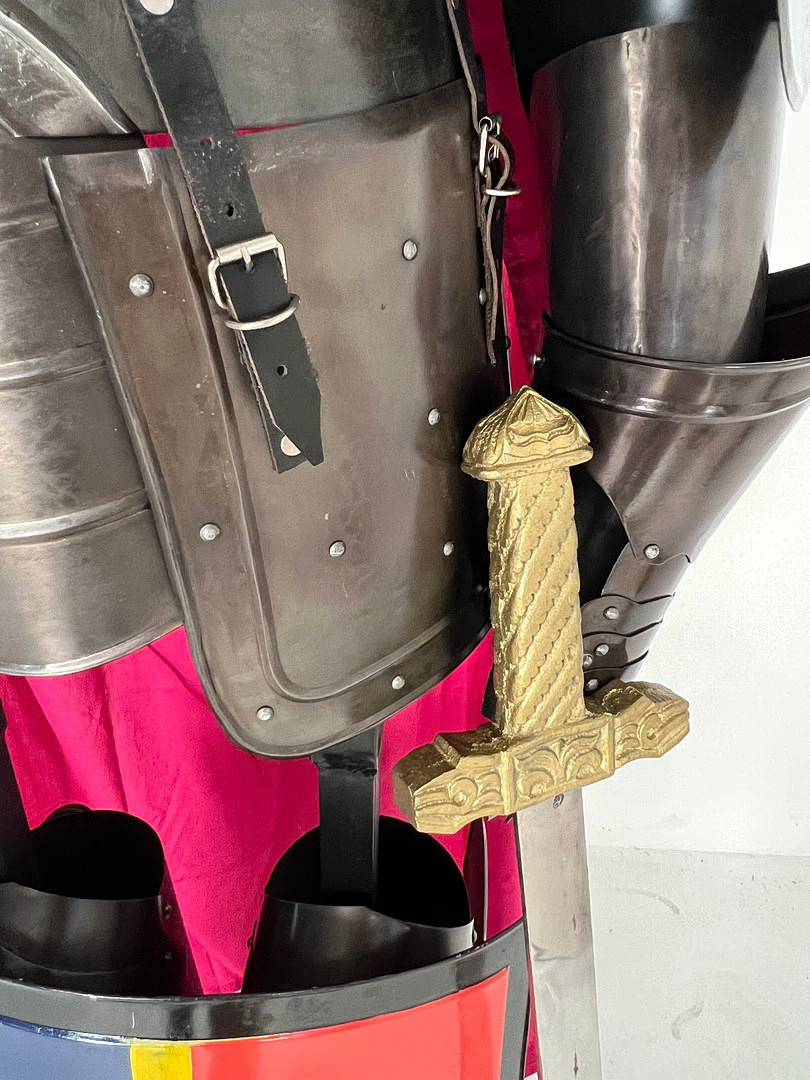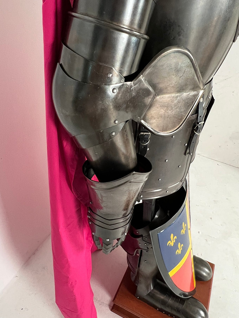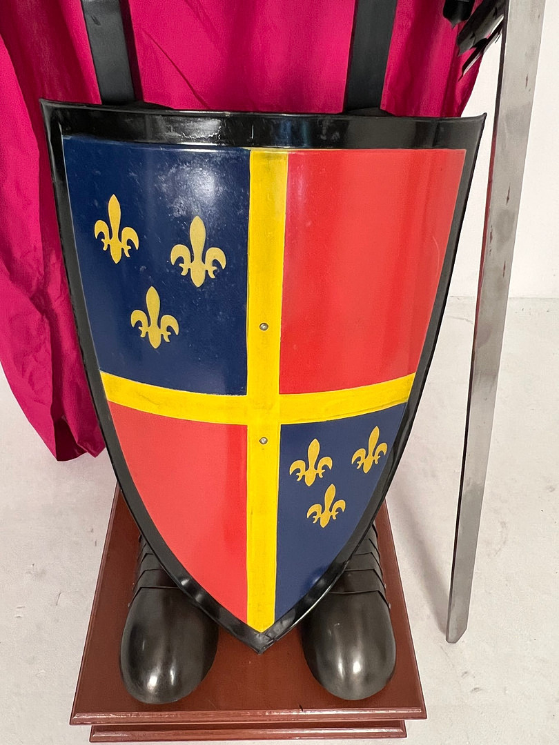 2489484. Ridderrustning, med skjold, sværd, kappe og rustningsstativ, replika.