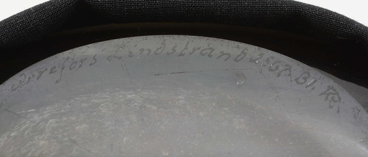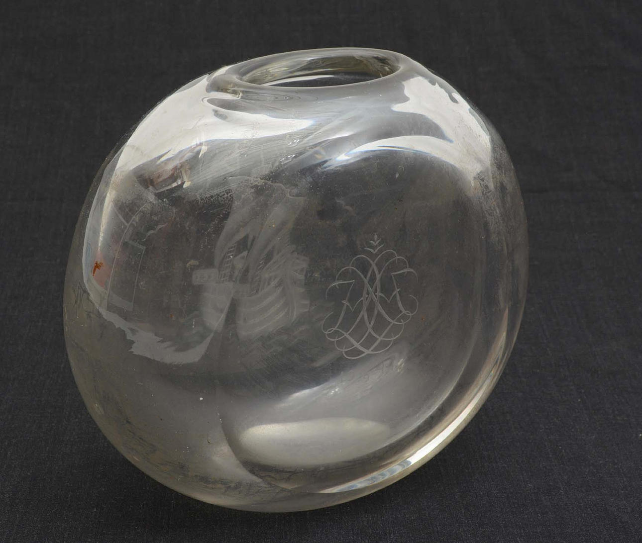 Skåret dekoration af skib, gaveindskrift. signeret Orrefors, Lindstrand, 2567, B1, KR 1944 20/9 Højde 20 cm, bredde 21 cm.