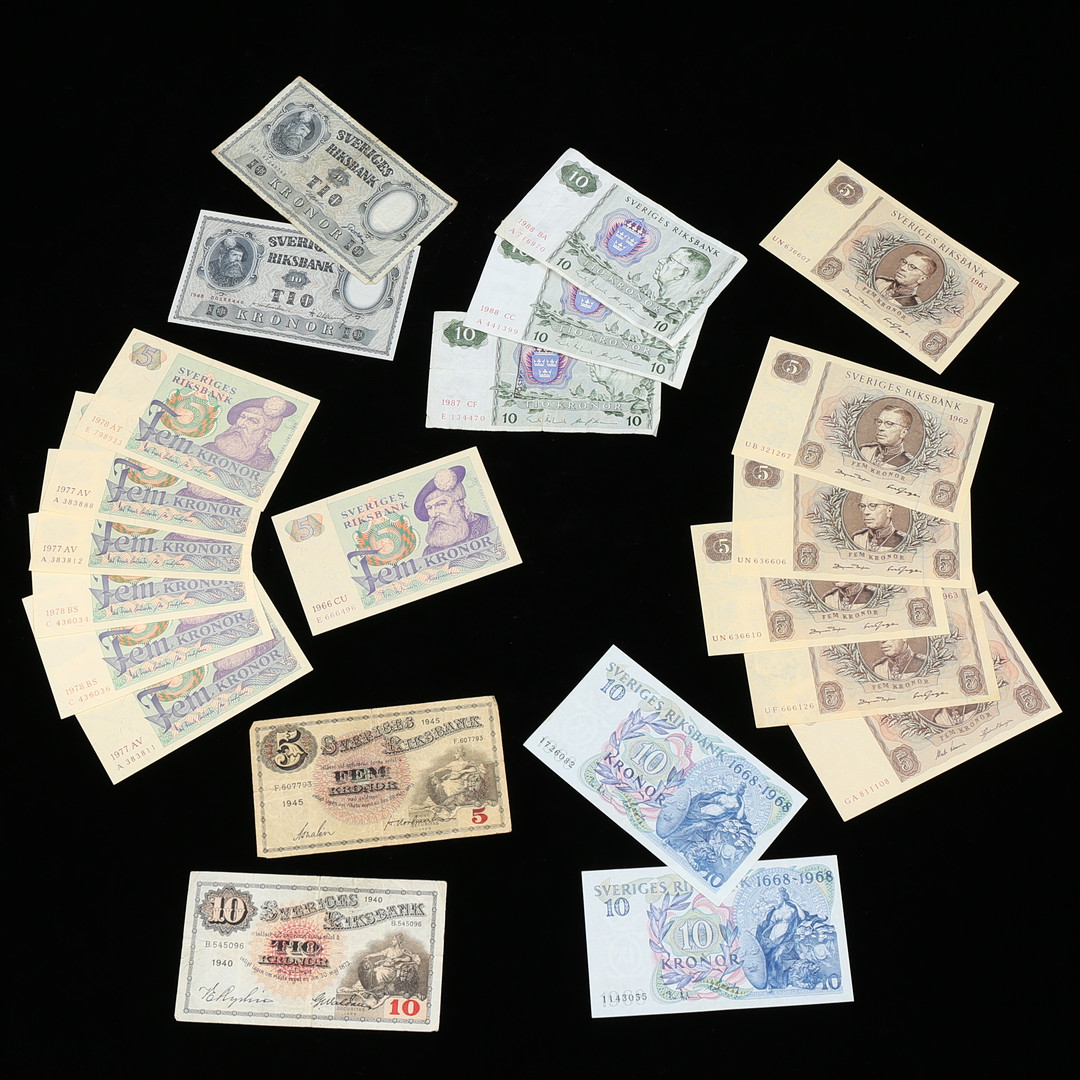 2490929. SEDLER, 22 stk, svenske 5 - 10 kr.