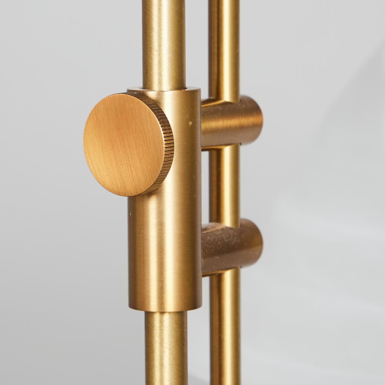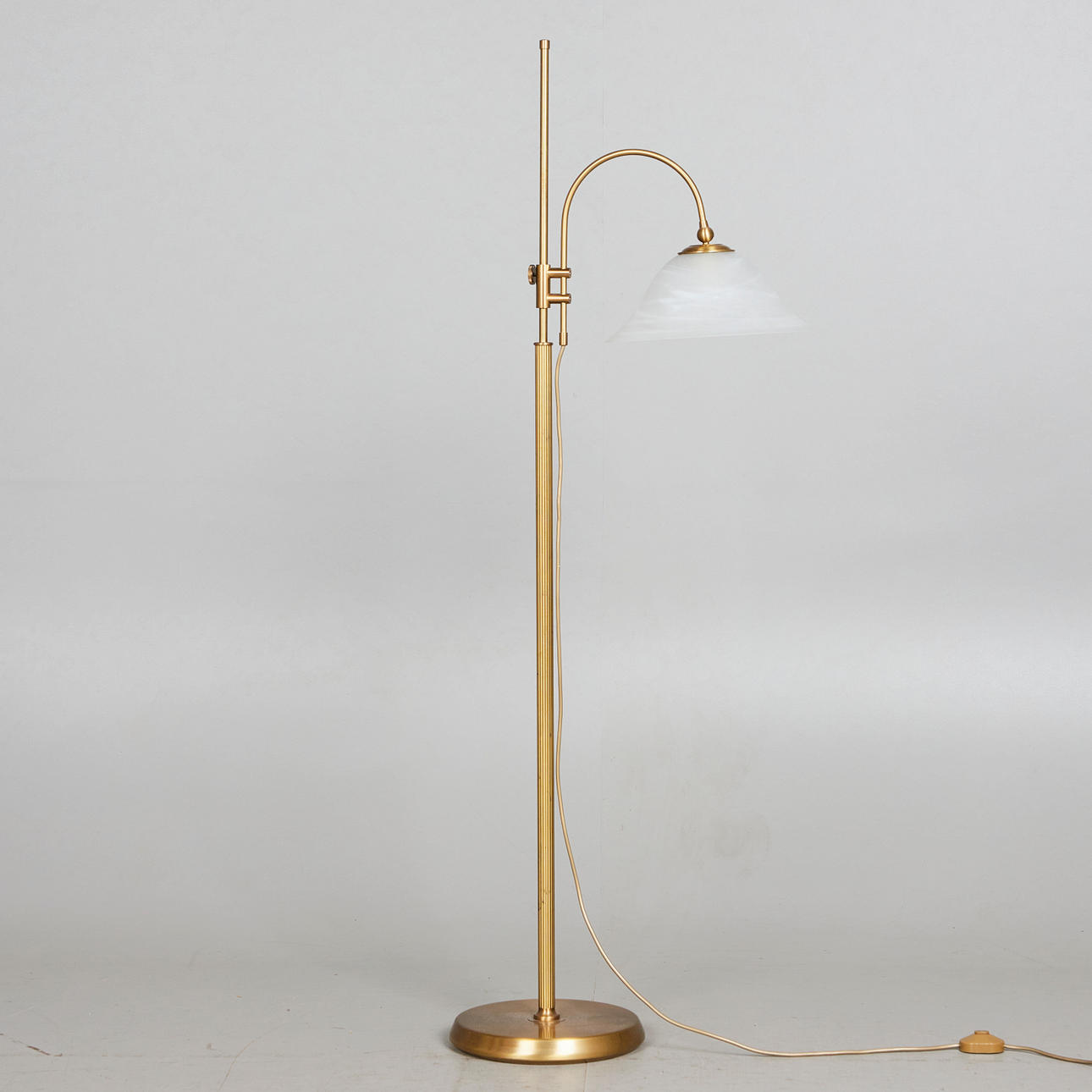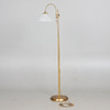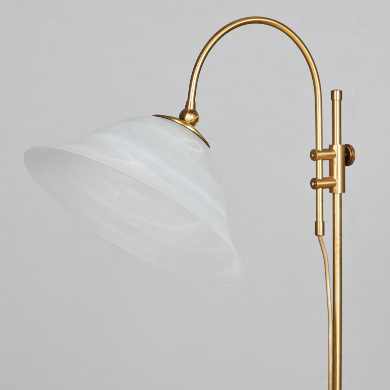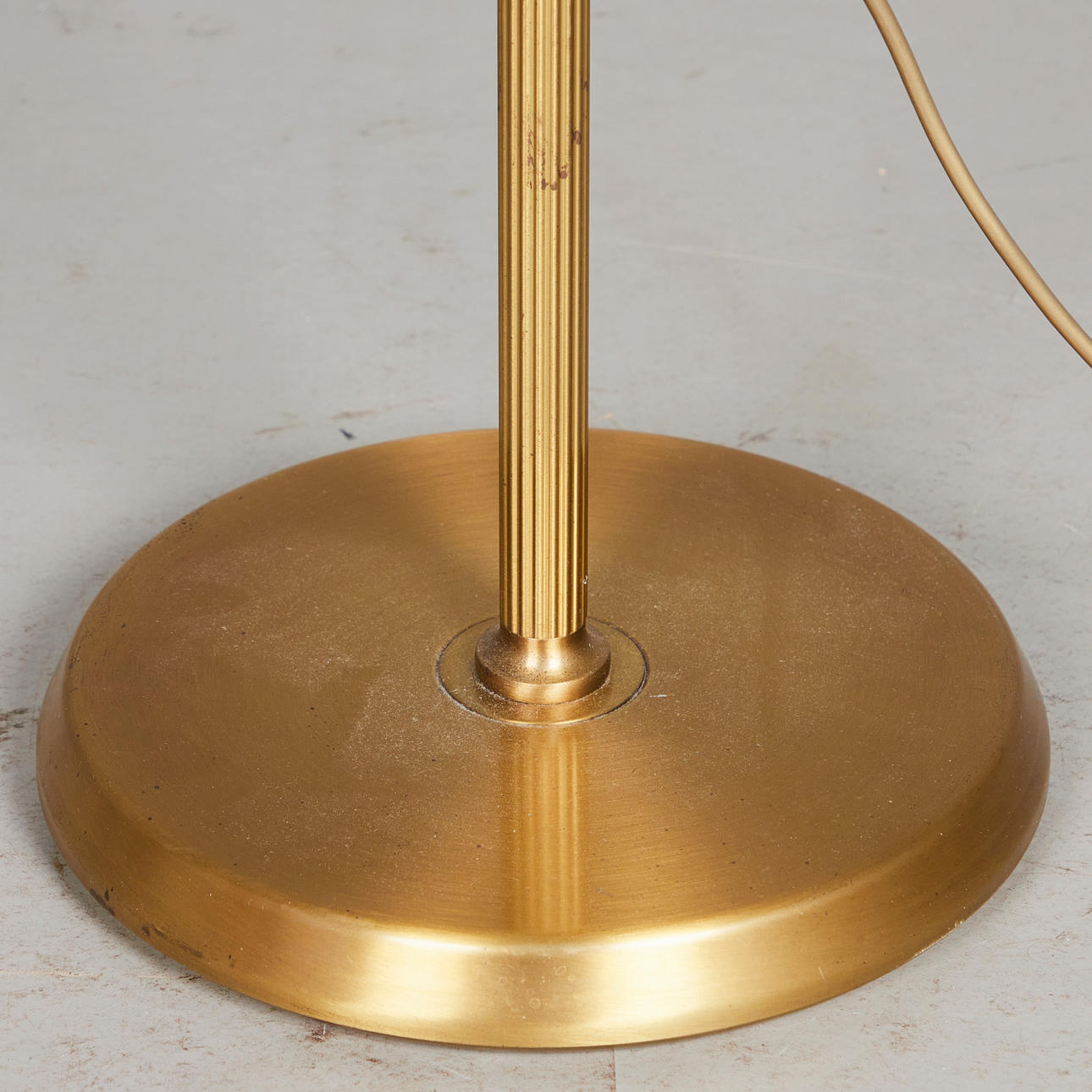 Gulvlampe / lampe, messing, glas. Gulvlampe med højdejusterbar messingarm i relief og konisk nedadvendt opalglas lampeskærm, udstyret med lampe, H.120-167cm, L.43cm, B.30cm.