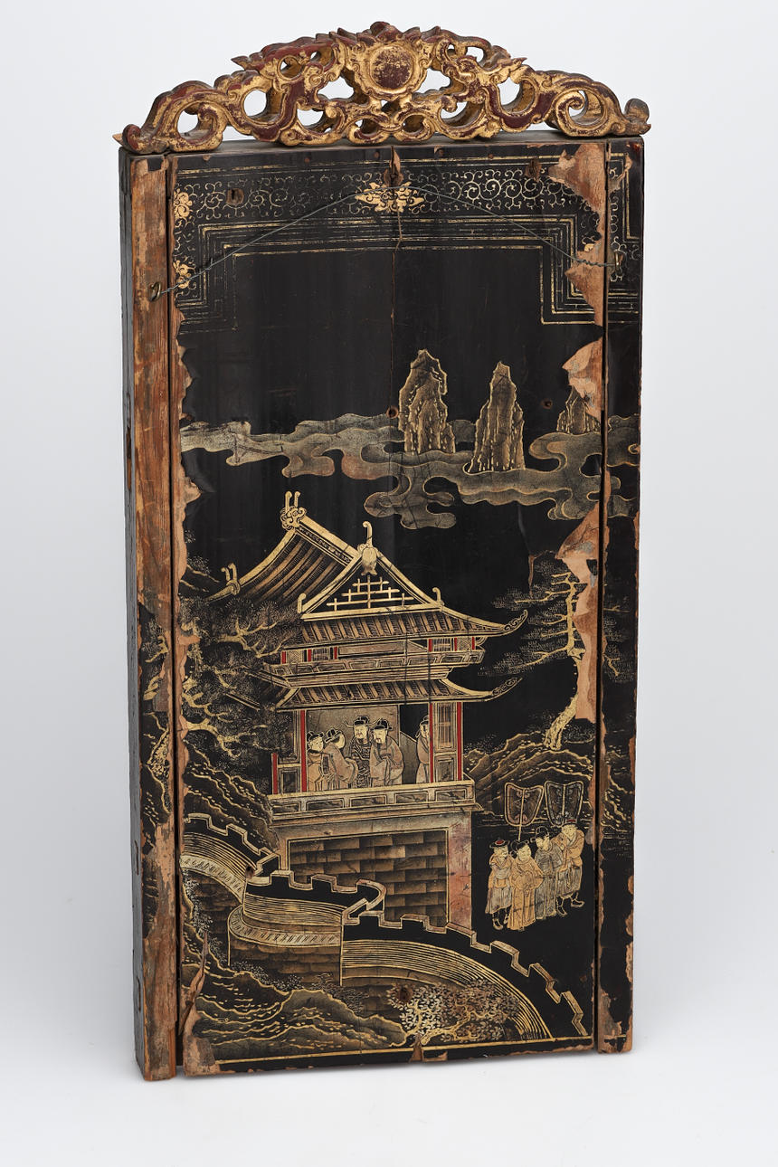 Højde 54, bredde 26 cm. Træudskårne figurer i højt relief. Gennembrudt forgyldt våbenskjold. Figurmaleri på bagsiden.