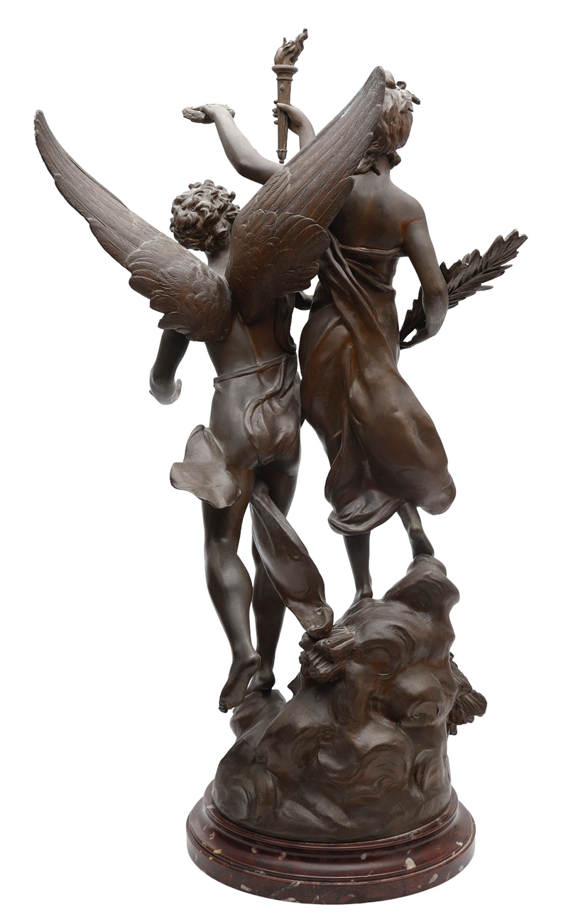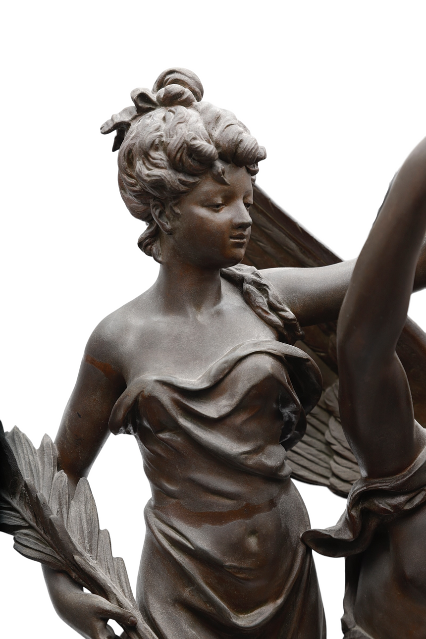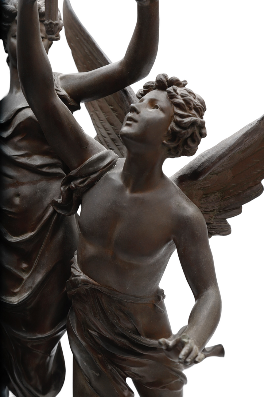 Pegefingeren på venstre hånd af den mandlige figur mangler. Restaurering og mindre defekter, især i patina.