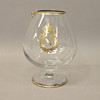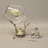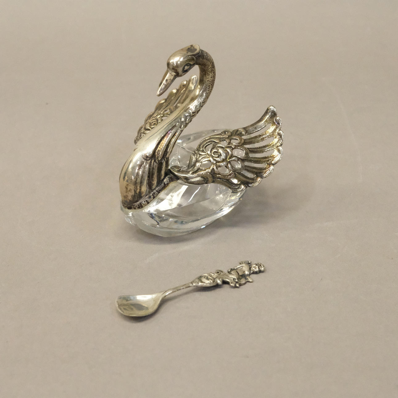 Cognacvarmer i glas og sølv, kop af glas med forgyldt monogram, højde 14,5cm, brænder i sølvvægt ca.145 gram, saltkar i sølv og glas, højde 7cm og sølvske, længde 5,5cm.