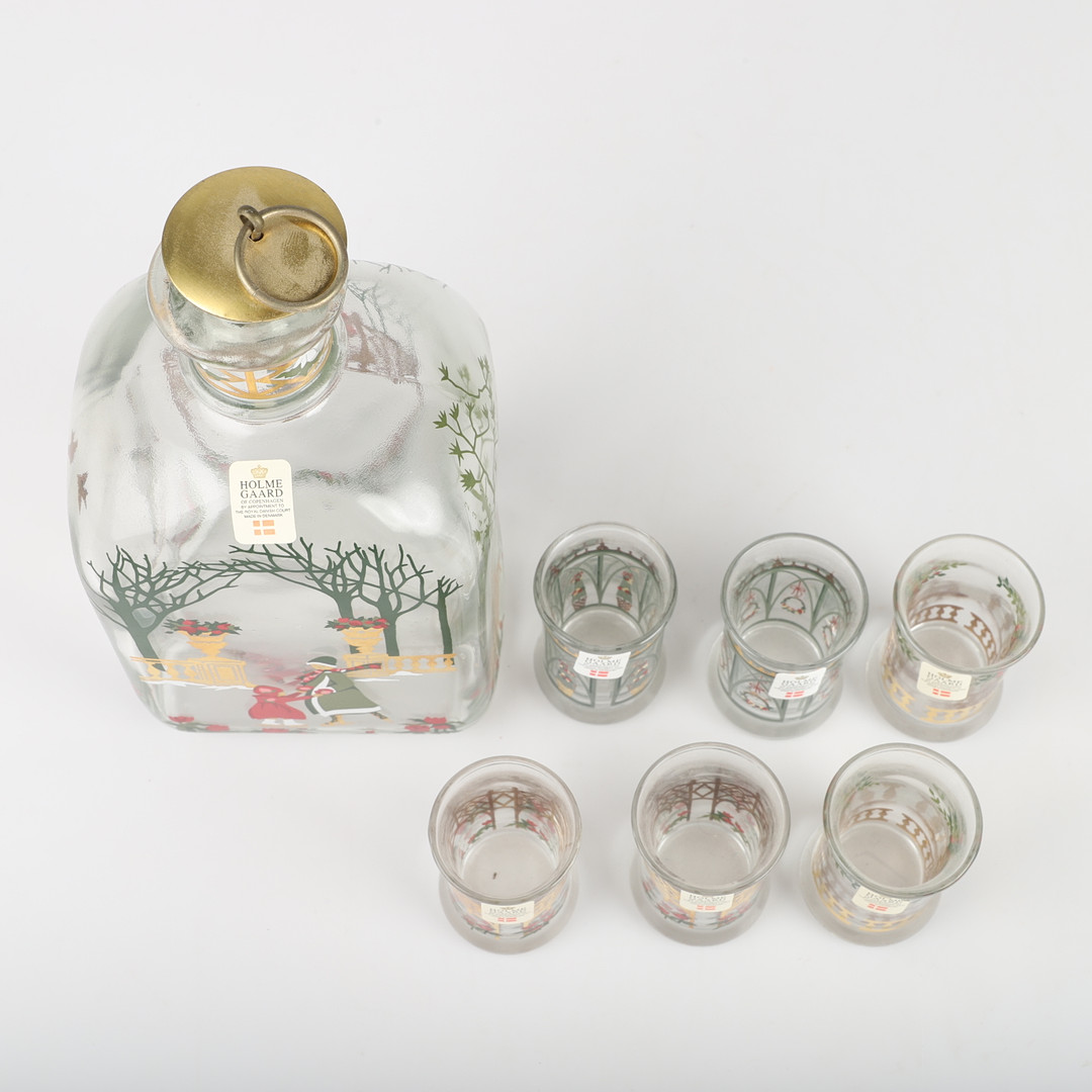 2514528. KARFE OG SNAPGLAS, 7 dele, malet glas, Holmegaard, Danmark.