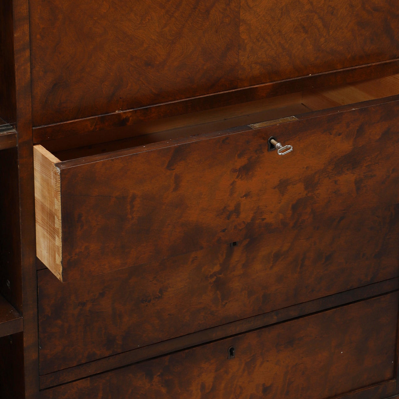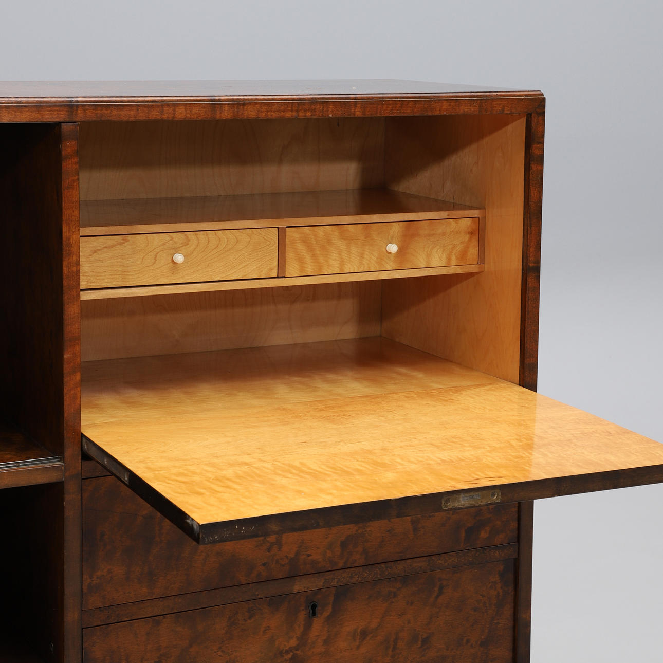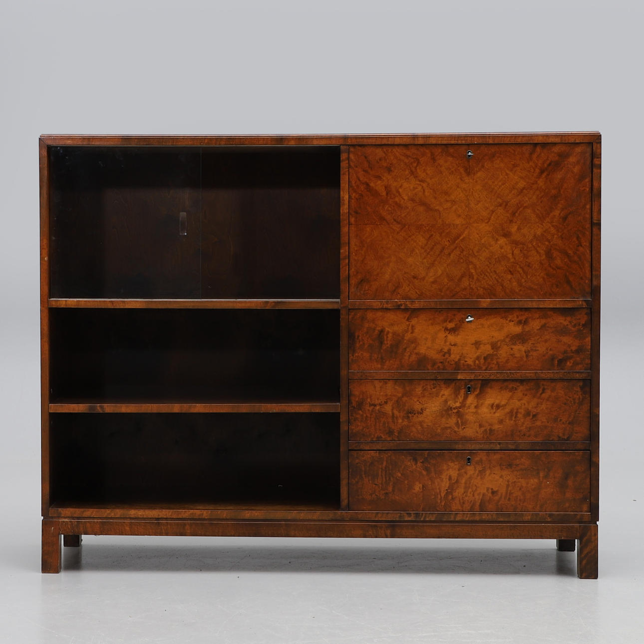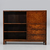 Bonad birk. Lige form. Foldedør med skuffer bagved, tre skuffer under. To glasskydedøre og hylder. Bredde 140, dybde 39, højde 111 cm.