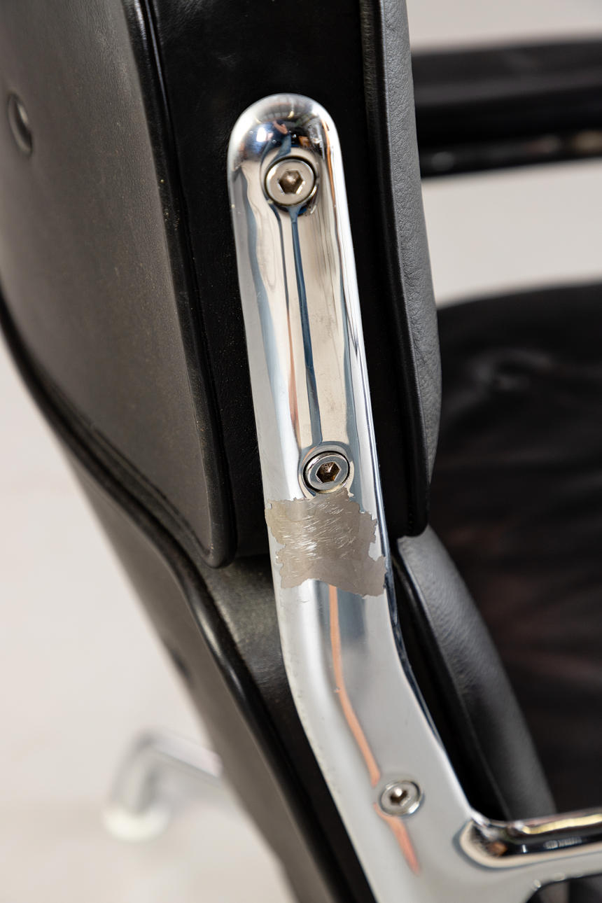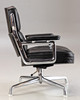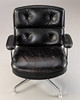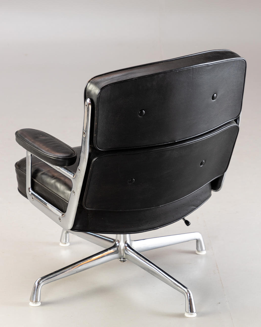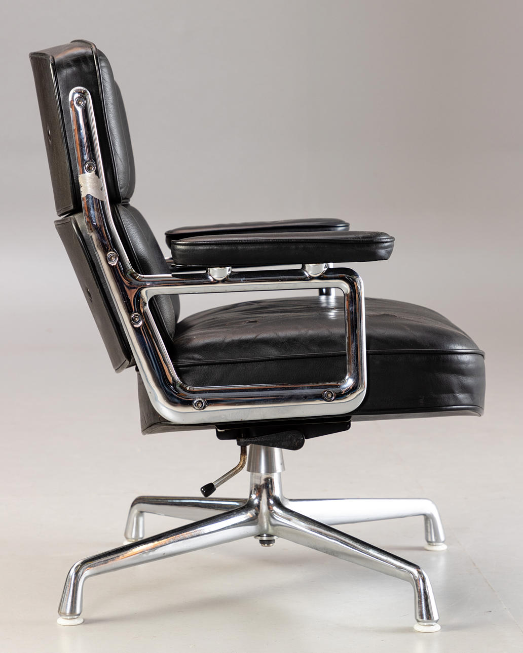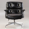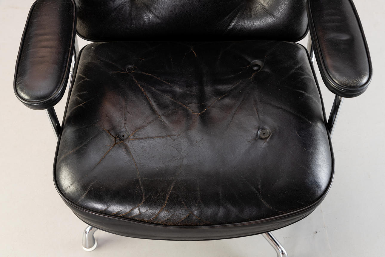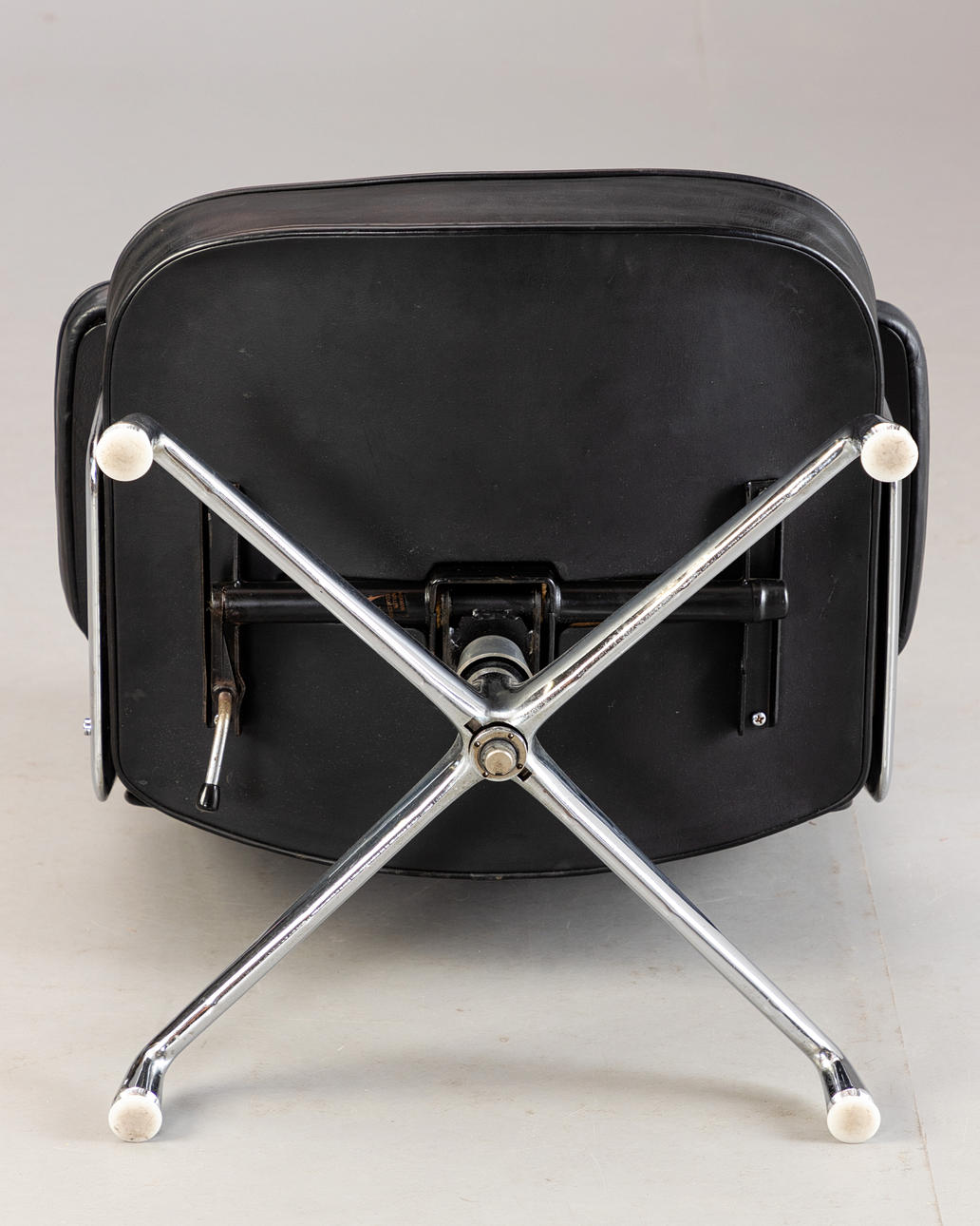 Lobbystol 'ES 108' fra Ray & Charles Eames. Herman Miller / Vitra. Design: 1960'erne. 4-stjernet sokkel af forkromet aluminium. Polstring betrukket med sort læder. tilbage vippe mekanisme.