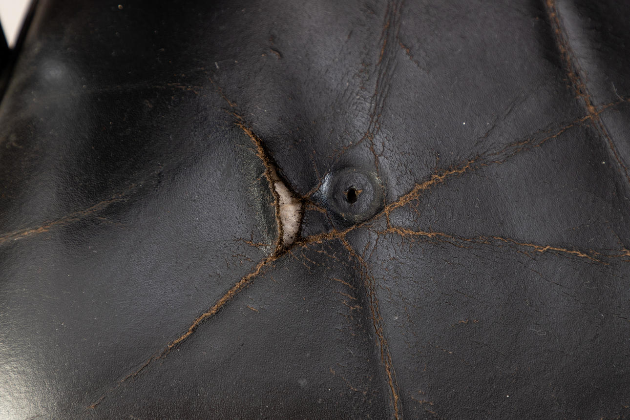 Tegn på alder og brug. Læder patineret. Sædeknapper mangler.