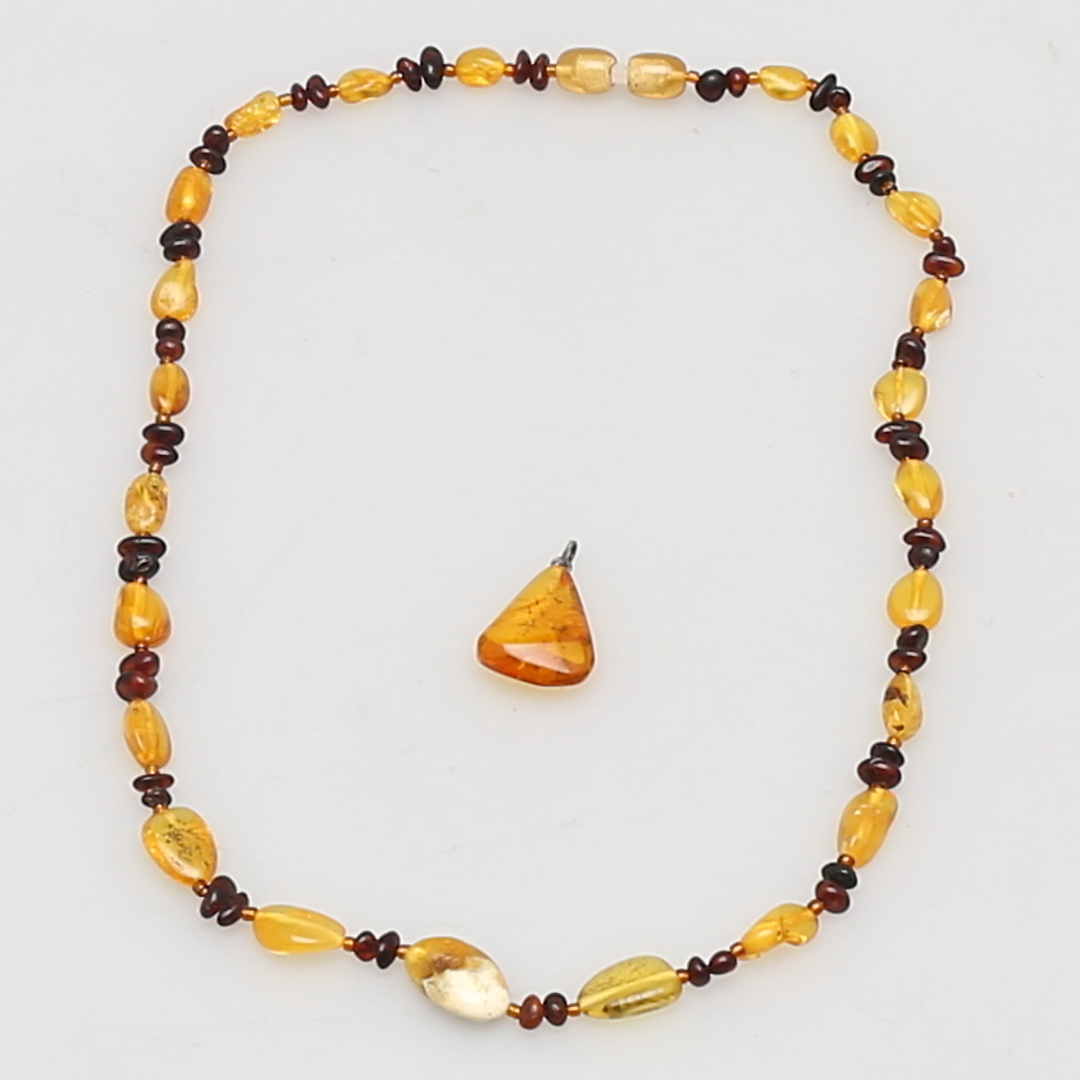 252117. HALSKÆDE og HANDSÆNG i rav, totalvægt 10 gram.